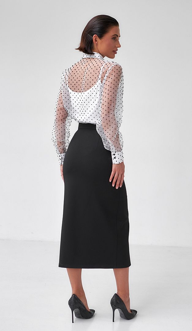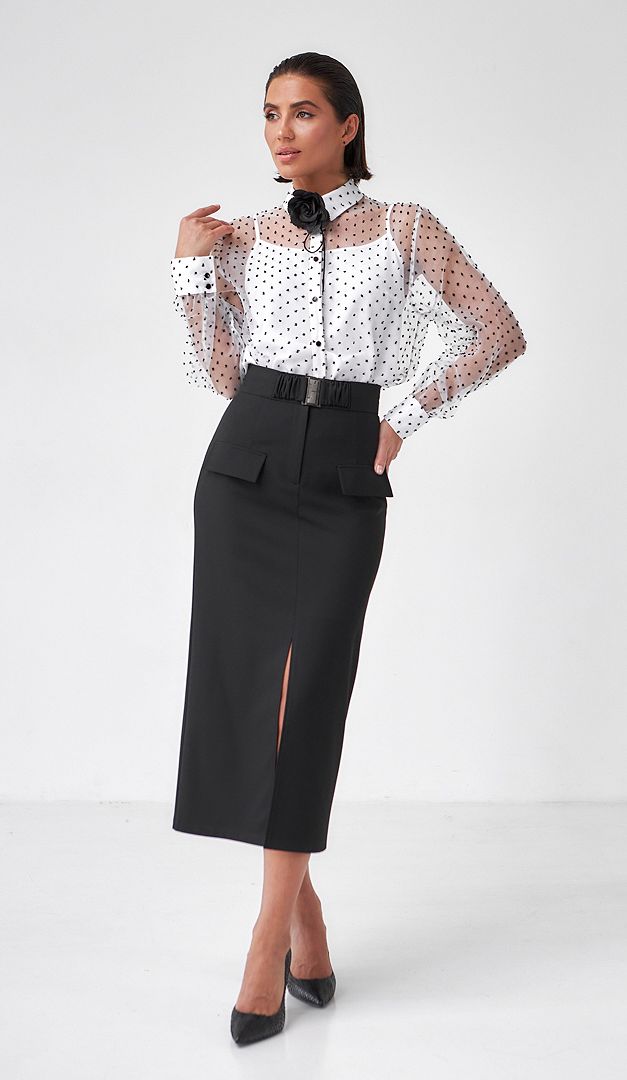 На фото створений образ з блузкою прозорою в горох з топом (арт.2392), блузкою Кліко (арт.1517) і жилетом жіночим прямим чорним (арт.2428).