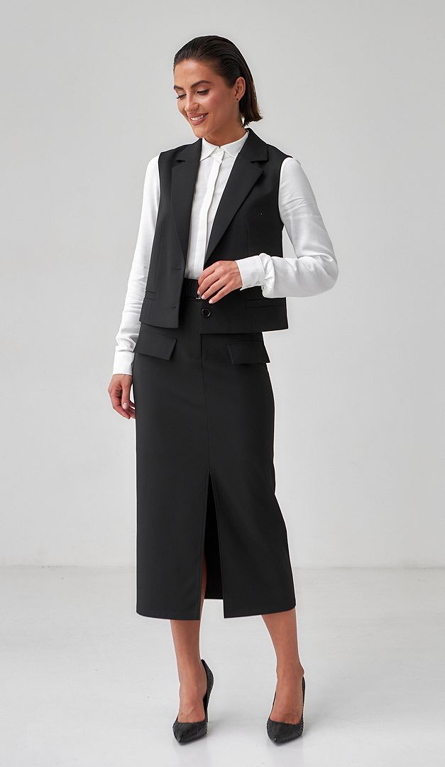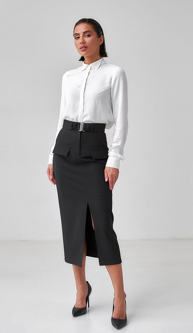 Для вишуканого елегантного образу ідеальним рішенням стане спідниця міді з розрізом чорна. Модель прямого облягаючого крою, з трендовою довжиною міді та широким поясом, на якому по центру переду розташована застібка на блискавку, два гаплики і ґудзик. Спідниця міді з розрізом чорна доповнена оригінальними деталями: пришивним поясом-резинкою з пряжкою, клапанами з імітацією кишень та високим розрізом по центру переднього шва, які додають їй ефектності та особливого стилю. З підкладкою.