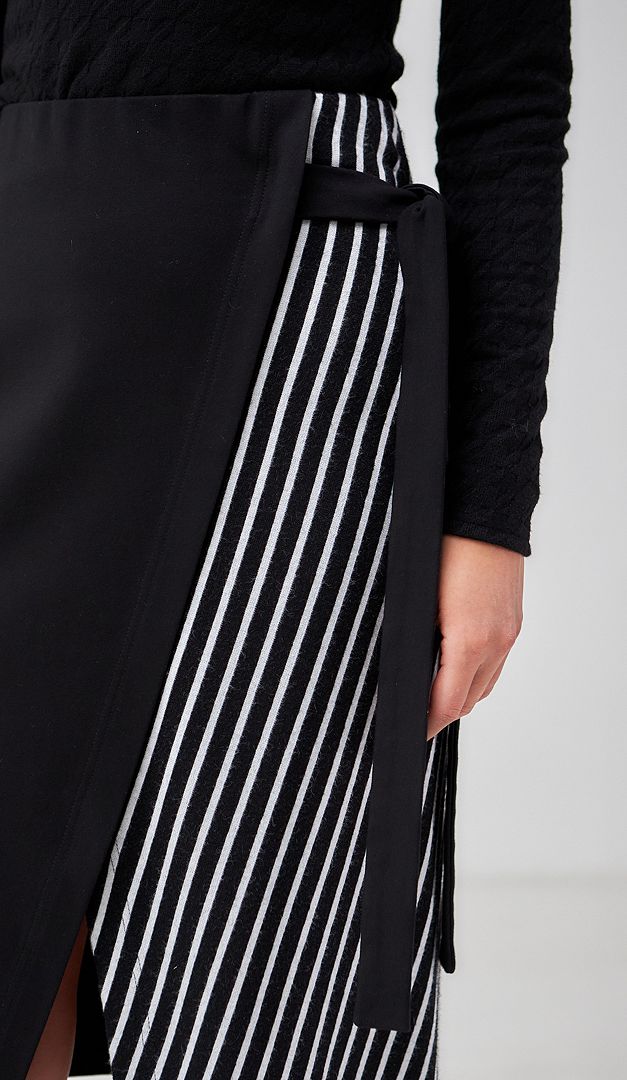 Спідниця трикотажна чорно-біла неймовірно комфортна трендова річ, яка стане універсальною базою для створення стильних образів. Модель розкльошеного до низу крою, з елегантною довжиною та широкою еластичною резинкою на поясі. Спідниця трикотажна чорно-біла доповнена оригінальними деталями:асиметричною комбінацією двох тканин, довгим поясом з одного боку та спокусливим розрізом по центру переду. Модель без застібок та підкладки.