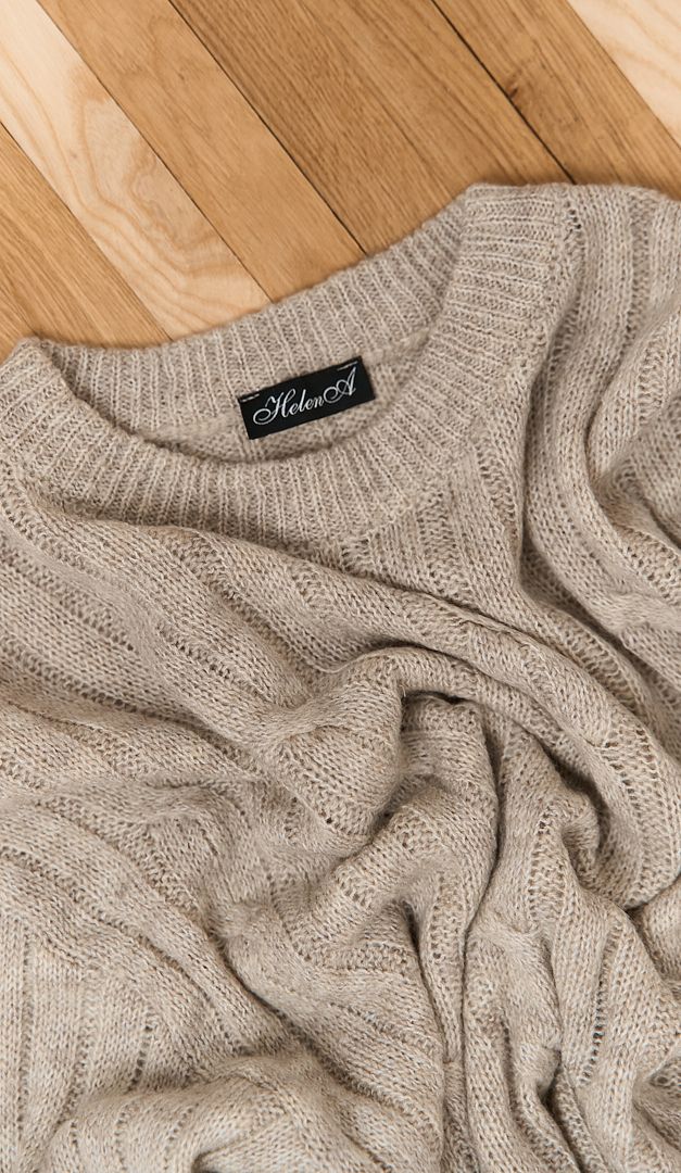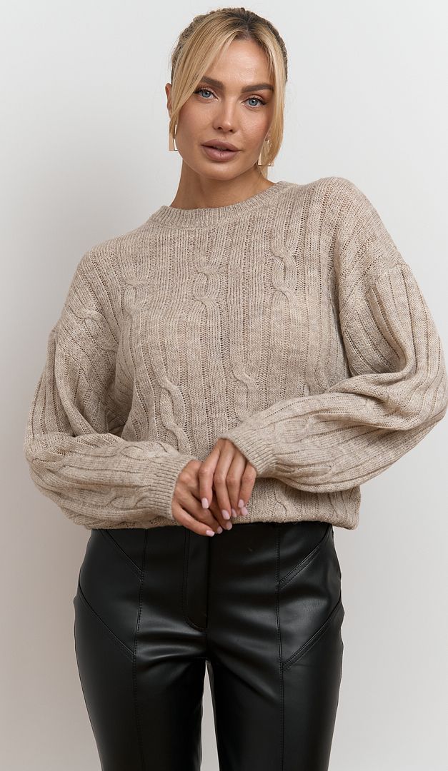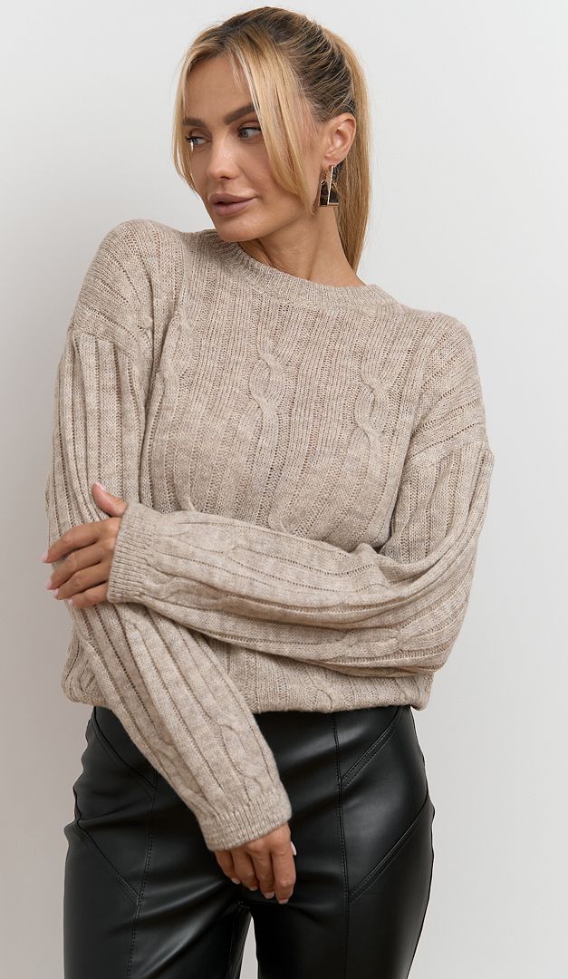 Об’ємний джемпер трикотажний з візерунком бежевий виконаний із ніжної вовняної пряжі середньої щільності. Модель вільного крою “oversize”, з неглибоким округлим вирізом горловини, приспущеною лінією плеча та довгим рукавами. Джемпер трикотажний з візерунком бежевий має напівпрозору фактурну в’язку з стильним малюнок "коси". Манжети рукавів і низ виробу оформлені фіксуючою резинкою. Такий джемпер стане ідеальним рішенням для створення повсякденних і романтичних образів.