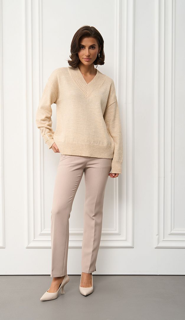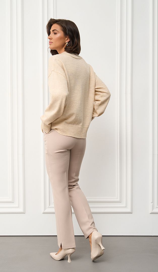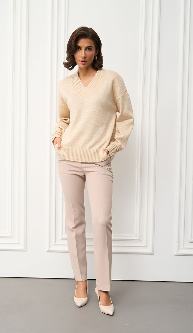 На фото створений образ з штанами з високою посадкою бежевими (арт.2735).