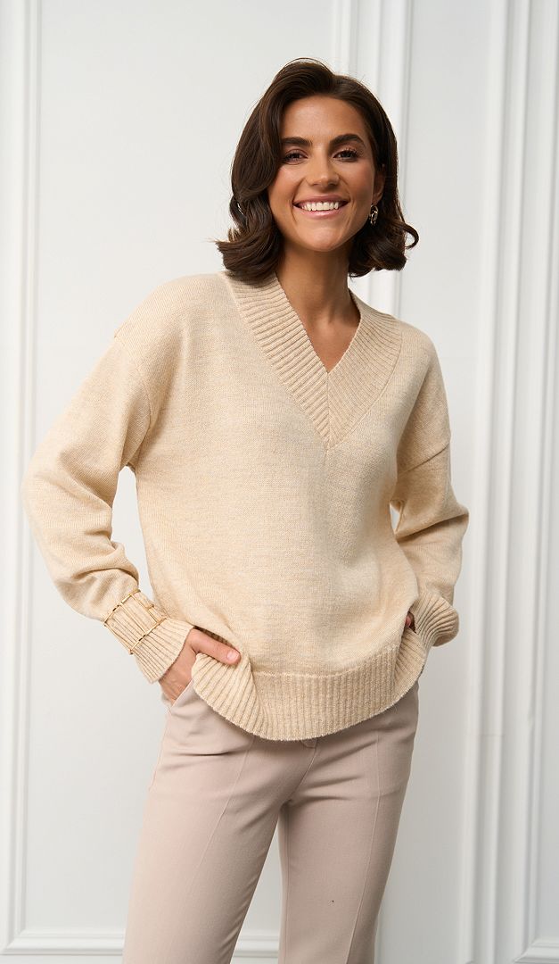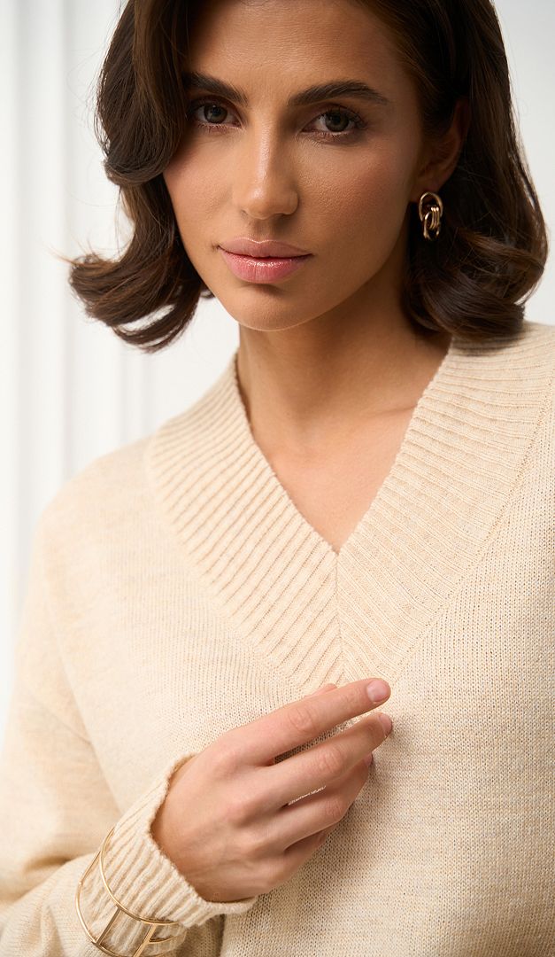 Джемпер трикотажний вершковий з вовни — універсальна річ, яка неодмінно знайде своє особливе місце в жіночому гардеробі. Модель вільного прямого крою, з неглибоким V-подібним вирізом горловини та довгим рукавом з манжетою. Джемпер трикотажний вершковий з вовни виконаний з пряжі в складі якої 70% вовни, завдяки чому виріб забезпечить тепло та комфорт навіть у самий прохолодний день. Монохромний базовий колір дозволить вдало комбінувати джемпер практично з будь-яким низом, а широкі планки-резинки на манжетах, горловині та по низу виробу додають йому елегантності.