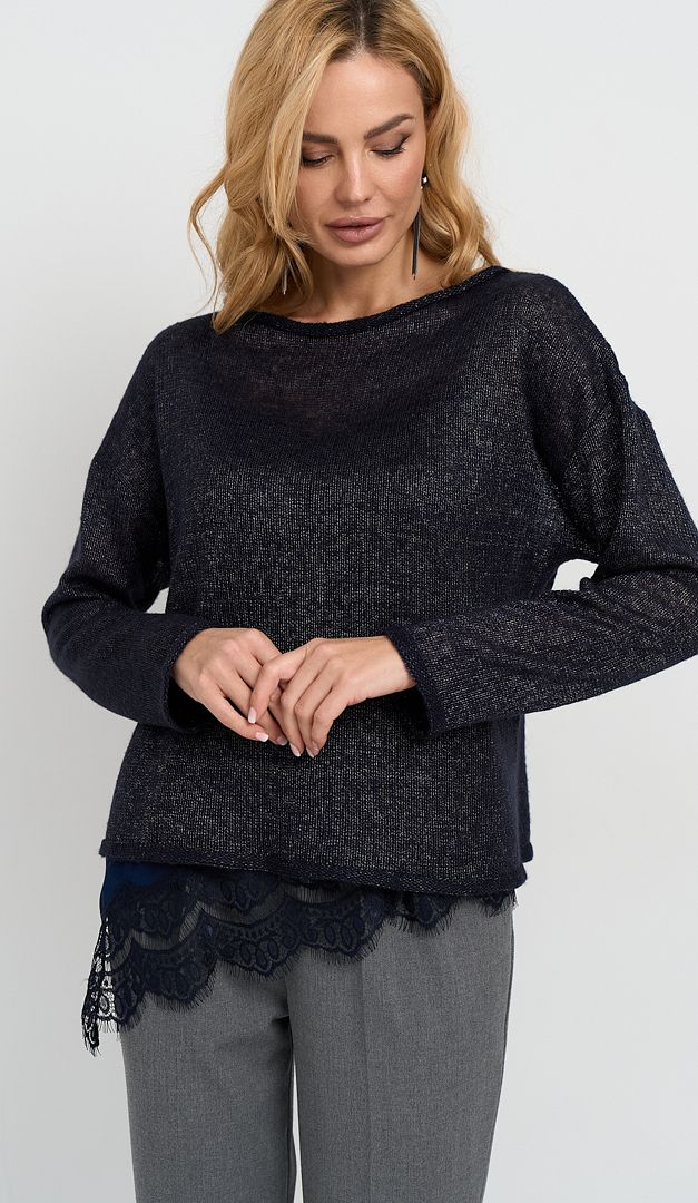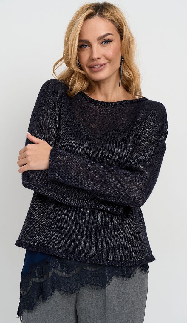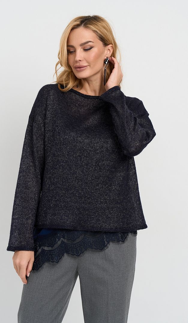 Джемпер жіночий синій павутинка – стильне доповнення до базового гардеробу. Модель вільного прямого крою, з довгим рукавом і оригінальним вирізом горловини у формі «човник». Джемпер жіночий синій павутинка виконаний із ніжного напівпрозорого трикотажу, дуже приємного на дотик. Завдяки своїй лаконічності, виріб буде вдало доповнювати як образи з класичними штанами і спідницями, так і аутфіти з улюбленими джинсами.