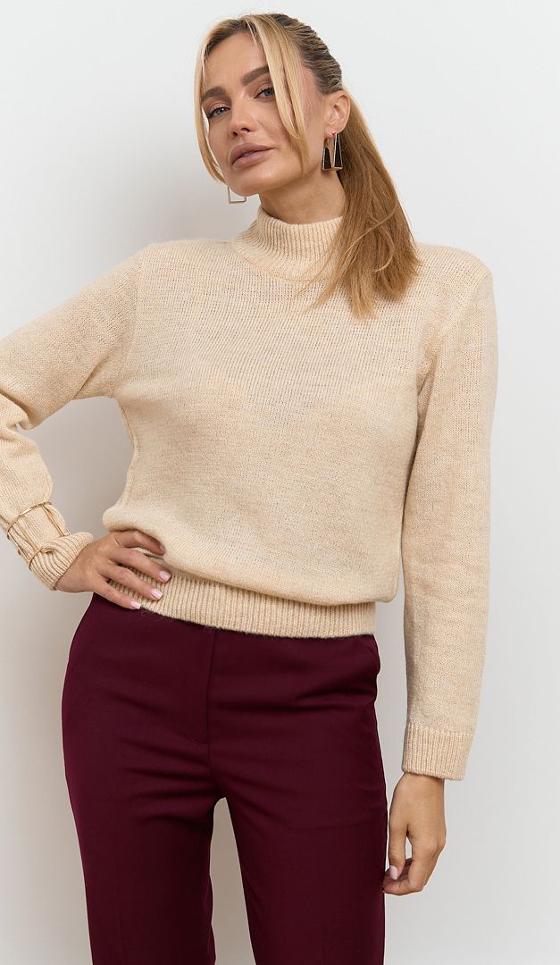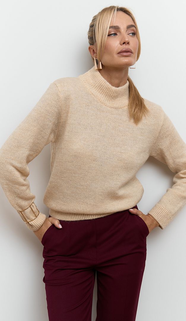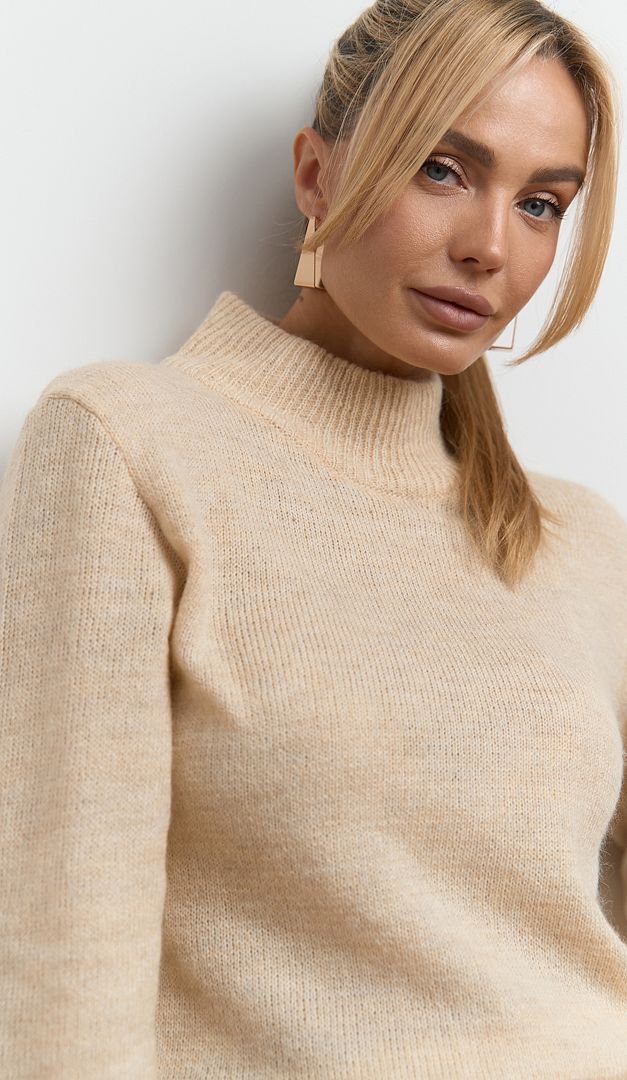 Джемпер жіночий трикотажний базовий шампань ідеальне рішення для стильних затишних образів. Модель вільного крою, зі зручним коміром-стійкою та довгим рукавом з манжетою. Джемпер жіночий трикотажний базовий шампань виконаний з тонкої меланжевої пряжі у склад якої входить вовна та мохер. Маючи гладке переплетення середньої щільності у трендовому монохромному кольорі виріб буде вдало виглядати, як в луках у стилі casual, так і в офісних аутфітах.