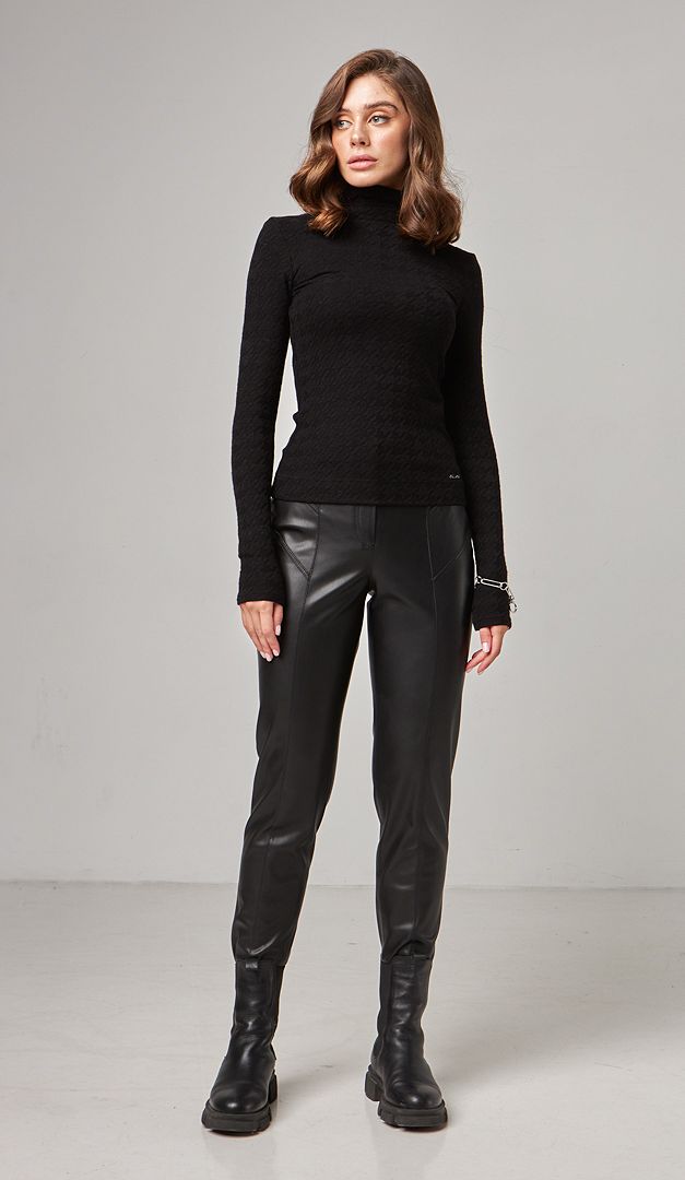 Для трендового образу в стилі total black рекомендуємо комбінувати гольф із брюками з екошкіри чорними (арт.2112).