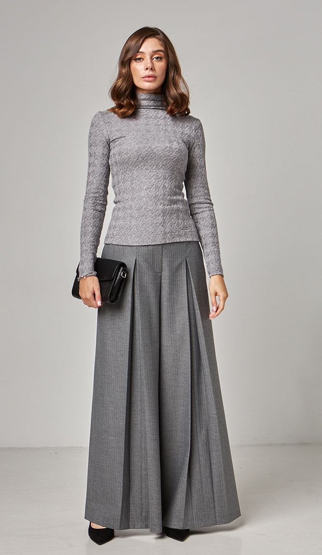 Для трендового образу в стилі total grey рекомендуємо комбінувати гольф із широкими брюками в смужку сірими (арт.1802)