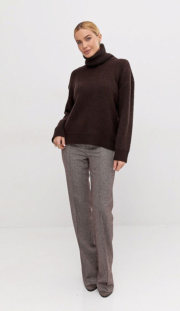На фото створений образ з штанами з вовни коричневий меланж (арт.2806).
