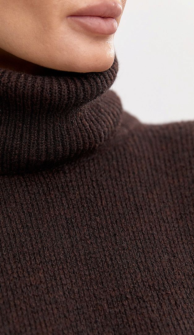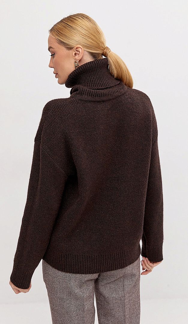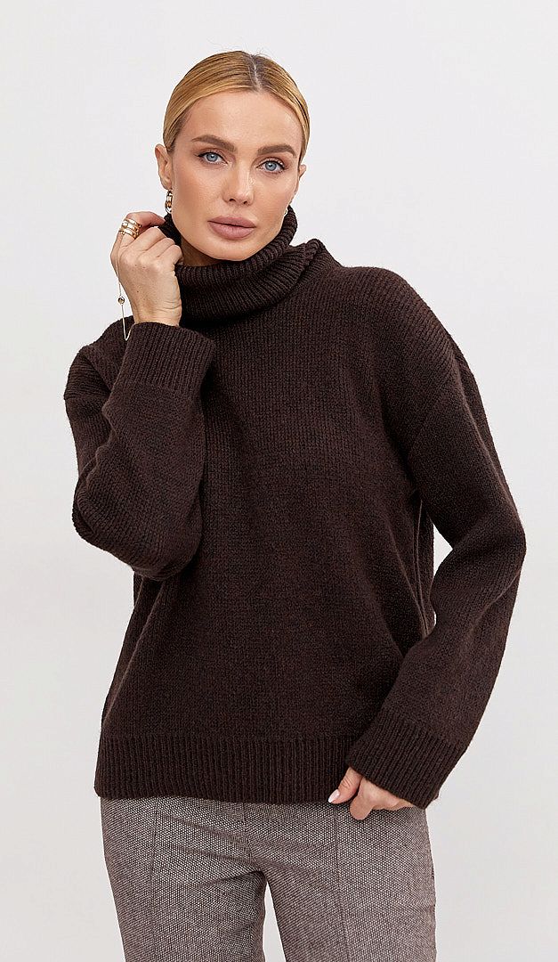 Светр трикотажний шоколадний — вдале рішення для холодного сезону. Модель вільного прямого крою, з довгим рукавом і відкладним коміром-стійкою. Светр трикотажний ний виконаний в трендовому монохромному кольорів, що додає виробу універсальності, а 85 % вовни в складі пряжі забезпечують відчуття цілковитого комфорту і тепла. Широкий манжет-резинка і аналогічний низ не тільки допомагають у формуванні красивого силуету, але й надають додаткової практичності моделі.