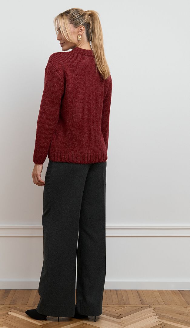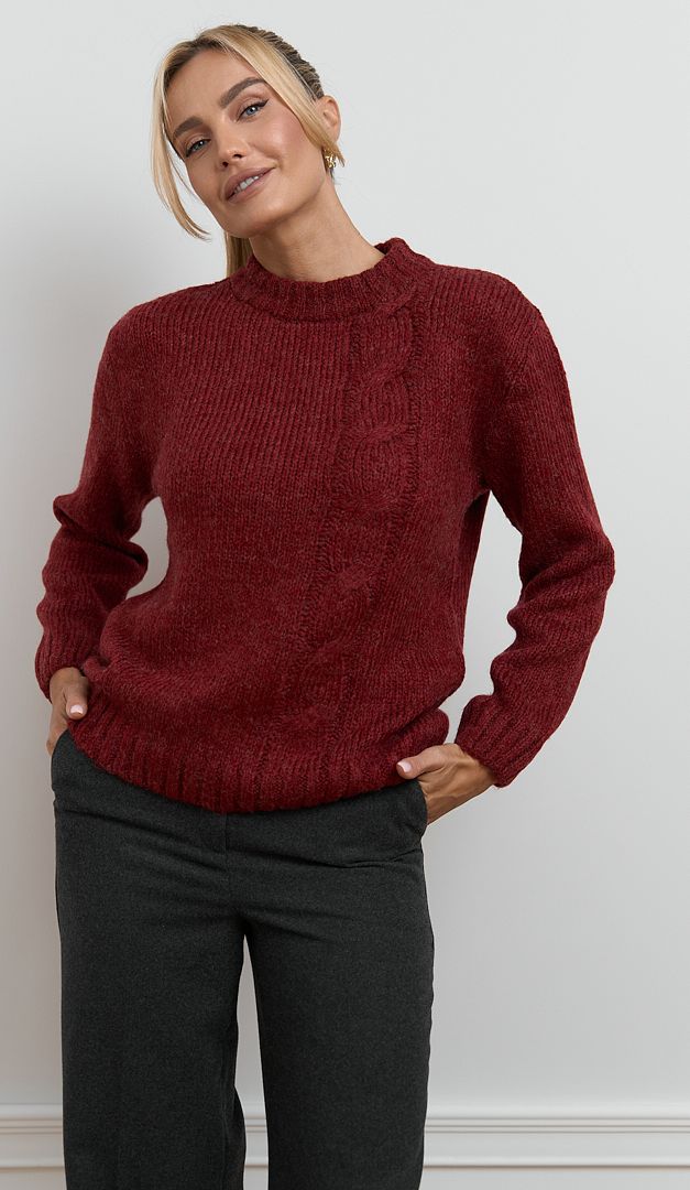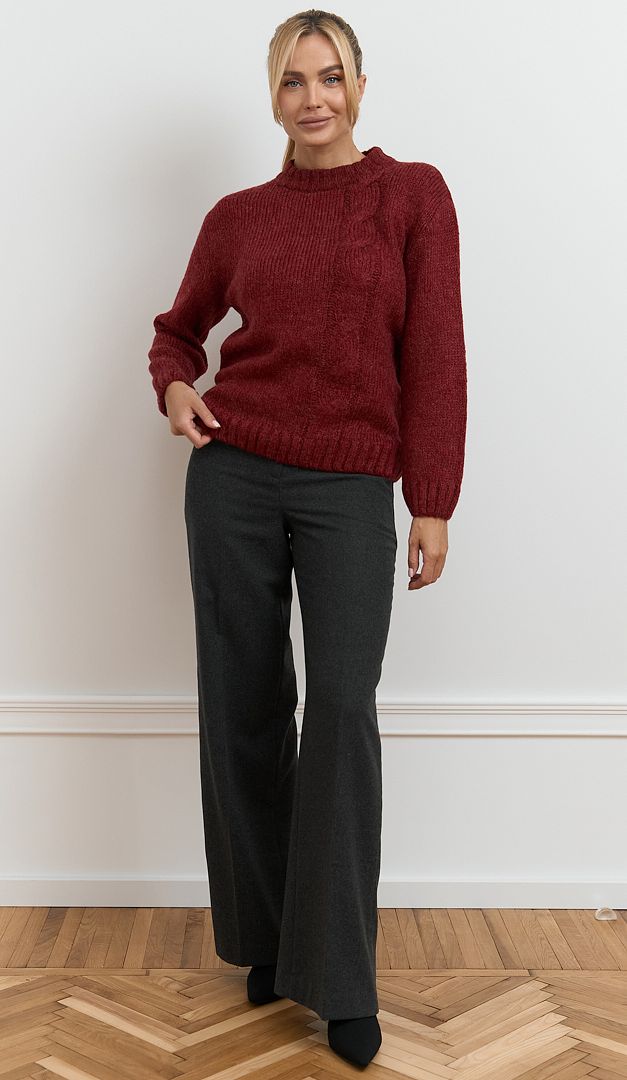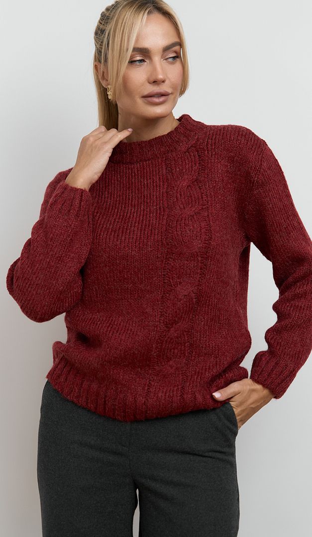 Светр трикотажний жіночий марсала виконаний із щільної теплої пряжі з вовною та мохером. Модель вільного крою, зі зручним округлим вирізом горловини, приспущеною лінією плеча та довгим рукавом. Светр трикотажний жіночий марсала доповнений стильним акцентом на передній поличці – вертикальним візерунком «коса». Низ виробу та його рукавів оформлені манжетою-резинкою, що фіксує і створює красиву форму. Цей затишний та приємний у носінні светр, стане ідеальною базою для різних повсякденних образів.