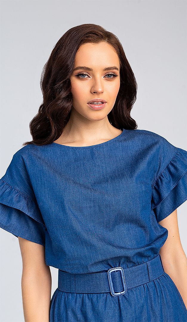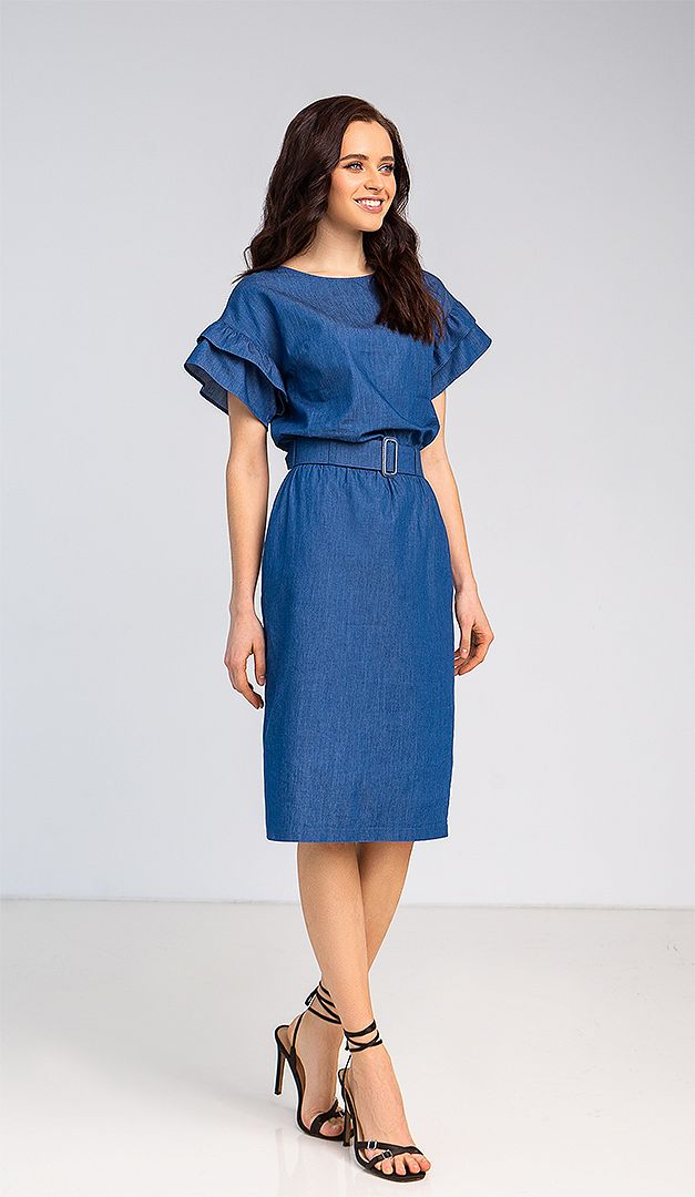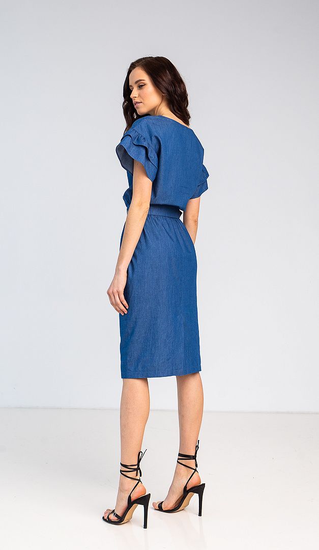 Ми поєднали класику і денім, щоб у Вашому гардеробі з'явилося не тільки трендове, але і актуальне для багатьох випадків нове джинсове плаття з рюшами! Ця модель ідеальна для теплої весни і літа, так як виготовлена з 100% бавовни. Джинсове плаття має прямий крій з акцентом на талії. До речі, талія підкреслюється відлітним поясом з тканини, і вшитою зсередини резинкою для кращої фіксації. Лаконічний верх плаття оформлений неглибоким вирізом горловини. Злегка подовжена лінія плеча романтично доповнена двома рядами акуратних рюш. Для зручності руху в середньому шві задньої частини є шлиця. Джинсове плаття без підкладки.