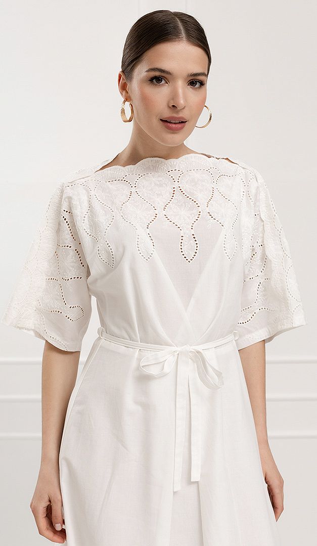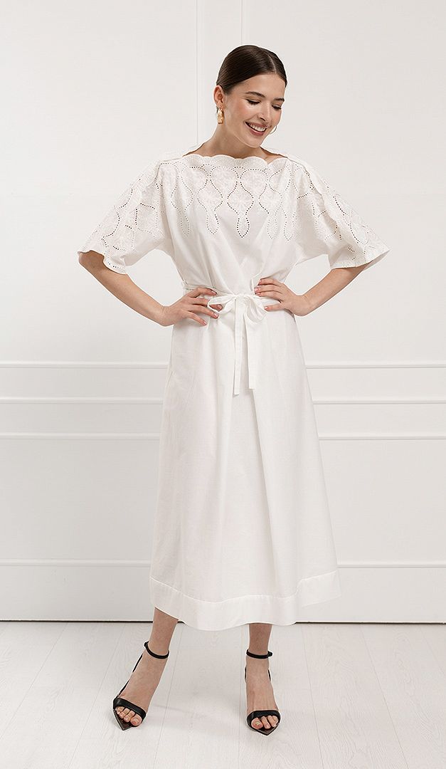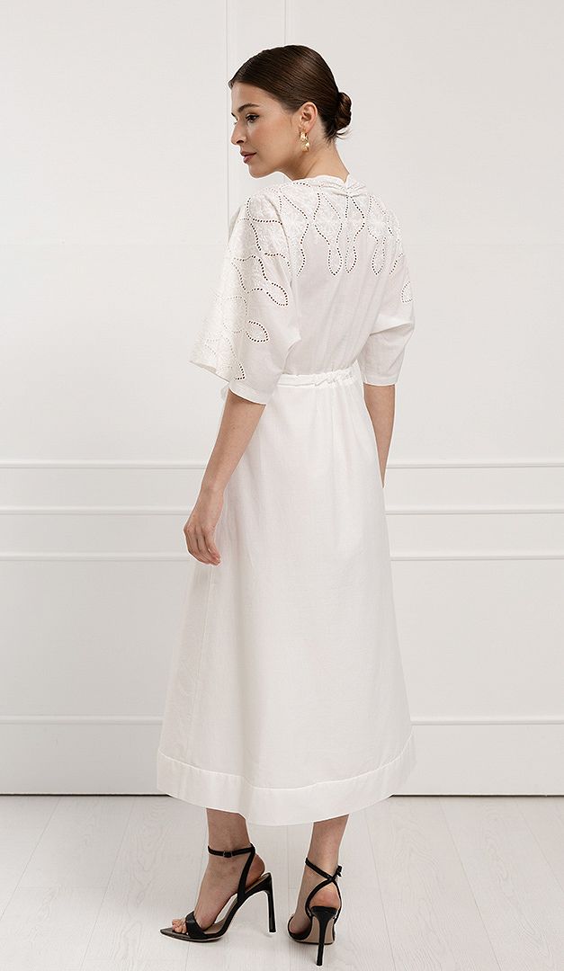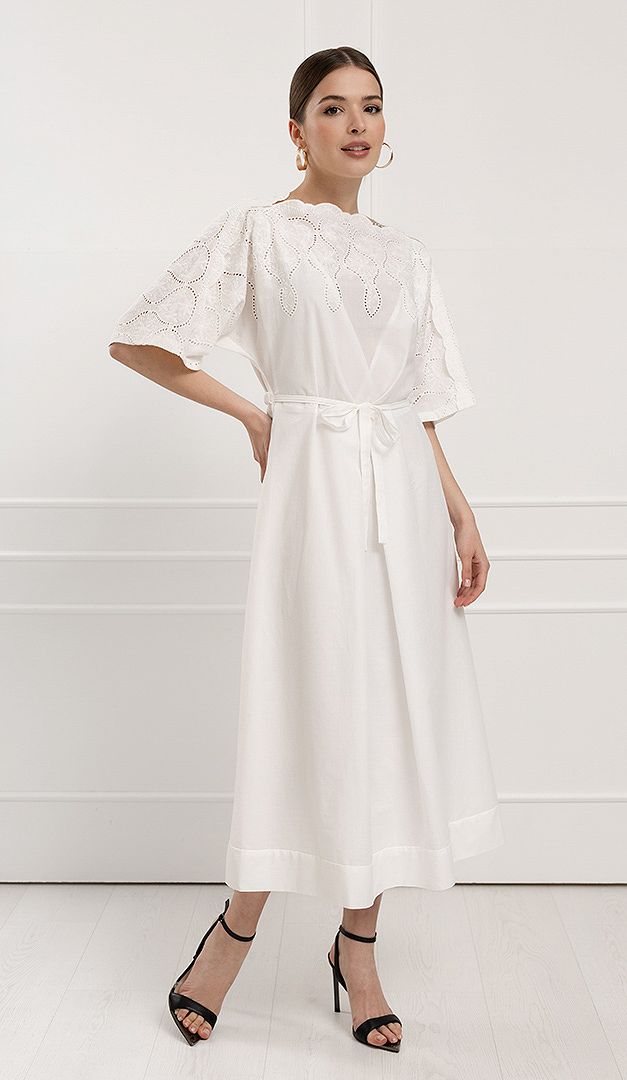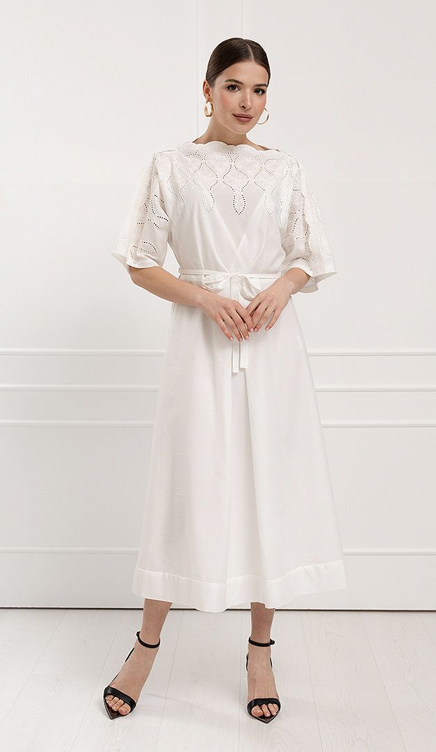 Сукня літня з вишивкою молочна – неймовірно вишукана річ для ніжних жіночних образів. Модель виконана зі зручним вирізом горловини у формі «човник», цільнокроєним коротким рукавом та елегантною довжиною міді. Сукня літня з вишивкою молочна має відрізну лінію талії, яка підкреслюється тонким поясом із аналогічної тканини. Верх виробу прикрашає красива мереживна вишивка, що додає особливого шарму та ефектності. Модель від талії злегка розкльошеного до низу крою та має фіксовані складки по центру переду. Сукня літня з вишивкою молочна виконана із легкої натуральної тканини – бавовна 100%, що забезпечить комфорт тілу за будь-якої температури. З підкладкою.