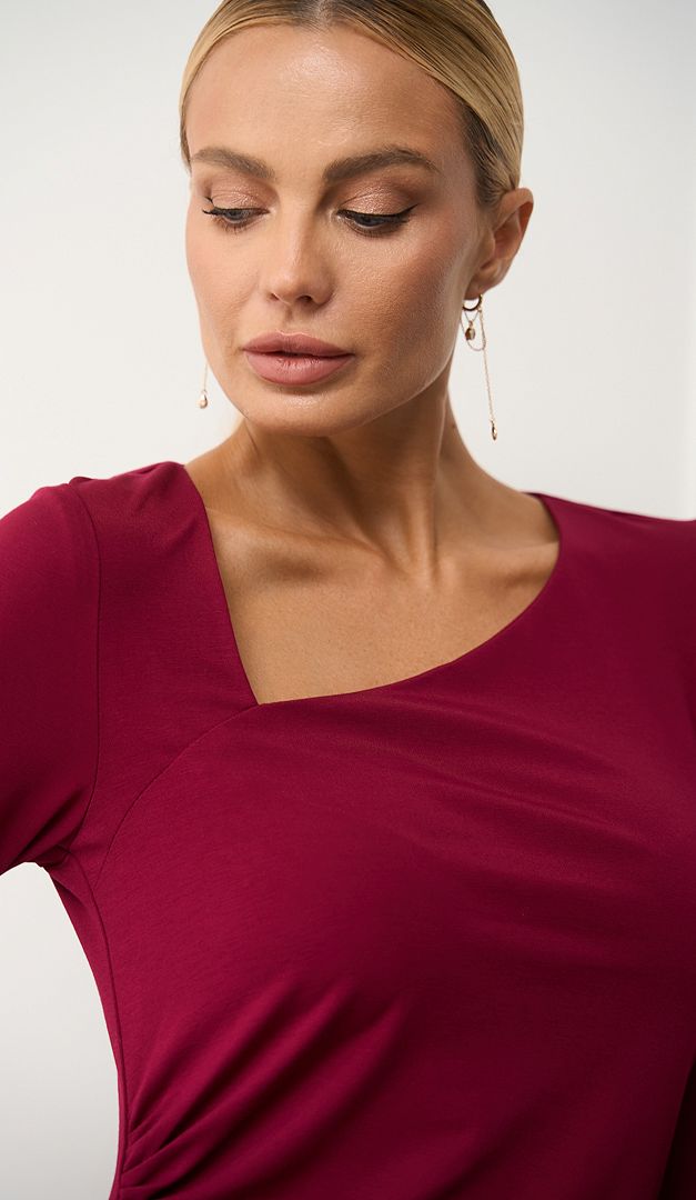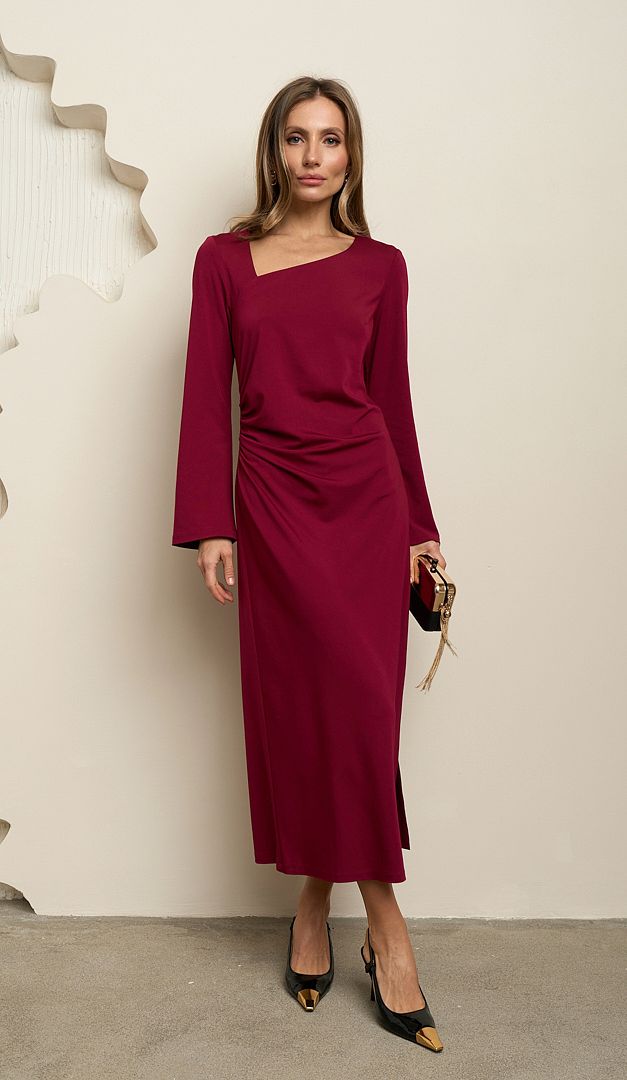 Сукня міді бордо додасть яскравості та максимум жіночності у ваш день! Модель напівприлеглого крою, горловина оформлена неглибоким асиметричним вирізом, довгий прямий рукав злегка розширений до низу. Сукня міді бордо має оригінальне драпірування по переду по одному боку та високу розпірку по низу іншого, завдяки чому створюється неймовірно витончений силует. Елегантна довжина міді додає виробу трендовості та універсальності. Модель без підкладки.