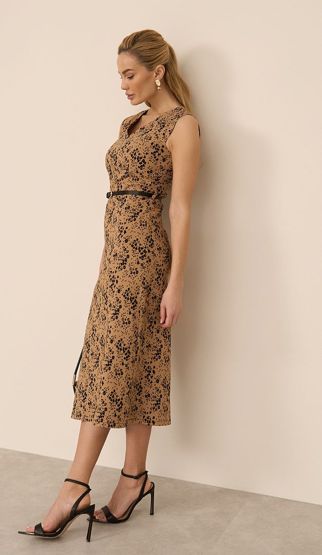 Сукня міді в квітковий принт карамельна додасть впевненості та підкреслить вашу жіночність — це універсальне рішення як для класичного ділового образу, так і для особливих подій. Сукня міді в квітковий принт карамельна має неглибокий V-подібний виріз горловини, відрізну лінію талії та злегка розширений до низу крій. Елегантності виробу додає трендова довжина міді, а контрастний квітковий принт підкреслює виразність створеного образу. Модель має практичну застібку-блискавку, яка розташована в задньому центральному шві та петлі для ременя в області талії. Без підкладки.
