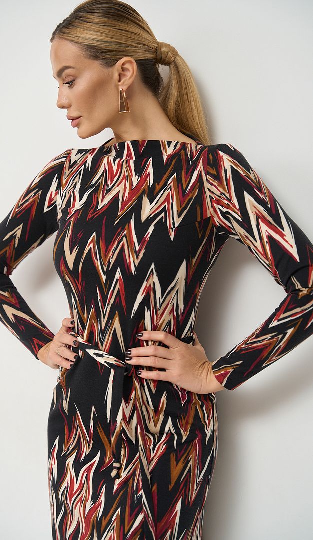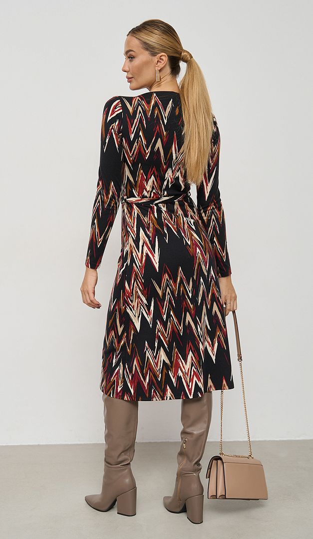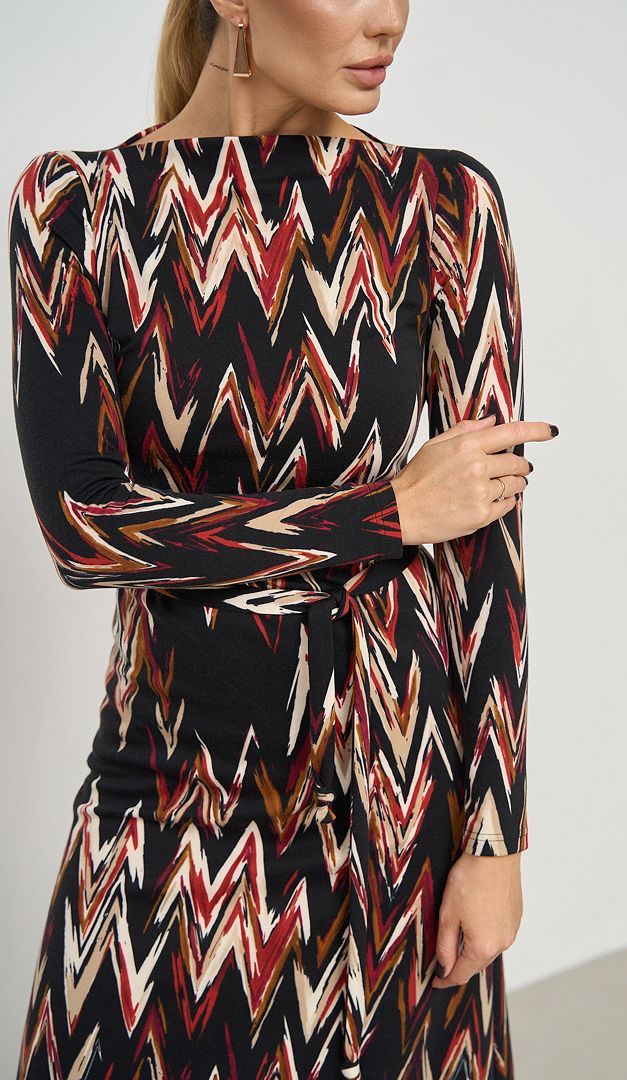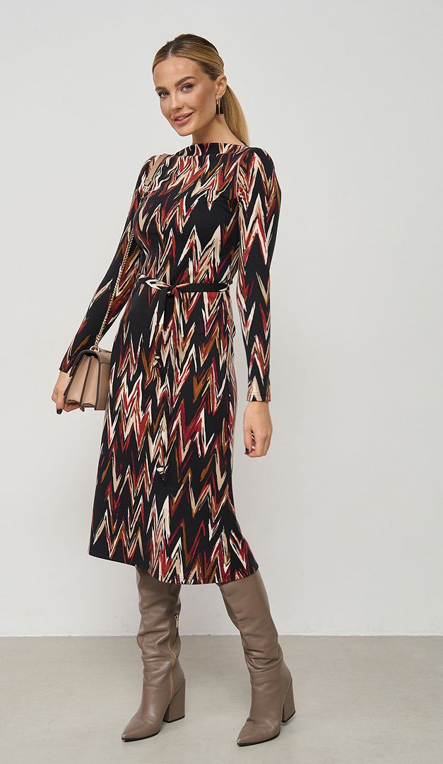 Сукня міді в геометричний принт — лаконічне та стильне рішення на кожен день! Модель злегка розширеного до низу силуету, з довгим рукавом і елегантною довжиною міді. Сукня міді в геометричний принт виконана з трикотажу середньої щільності в оригінальний принт, який візуально зробить силует більш струнким, а образ — більш виразним. Виріз горловини — закритий, оригінальної форми «човник». Лінія талії у виробі витончено підкреслена тонким поясом-шнурівкою з аналогічної тканини. Без підкладки та застібок.