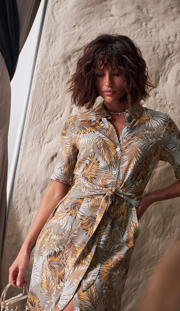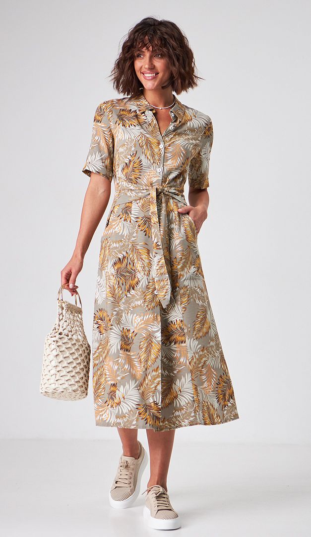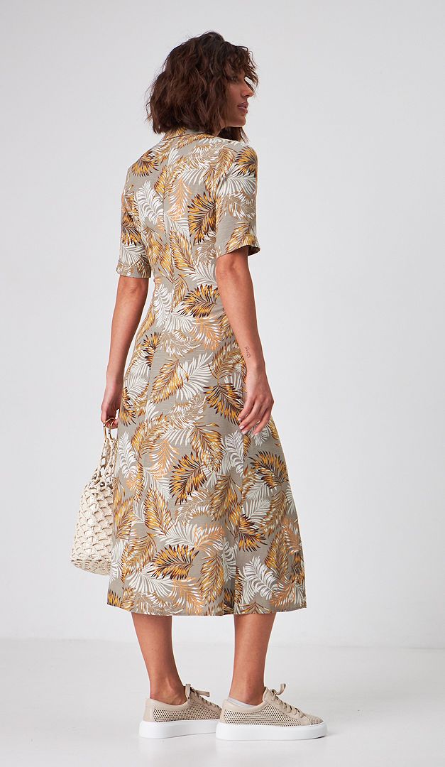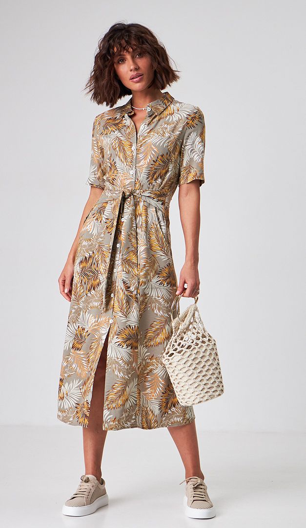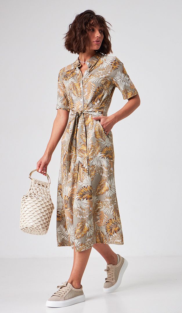 Плаття Онтаріо має напіввільний, злегка розширений до низу силует в поєднанні з практичною довжиною «міді». Горловина оформлена акуратним відкладним коміром на стійці. По центру плаття Онтаріо розташована зручна застібка на ґудзики. Талія в даній моделі підкреслюється вшитим тканинним поясом. Ще одна деталь — всіма улюблені накладні кишені. Плаття без підкладки.
