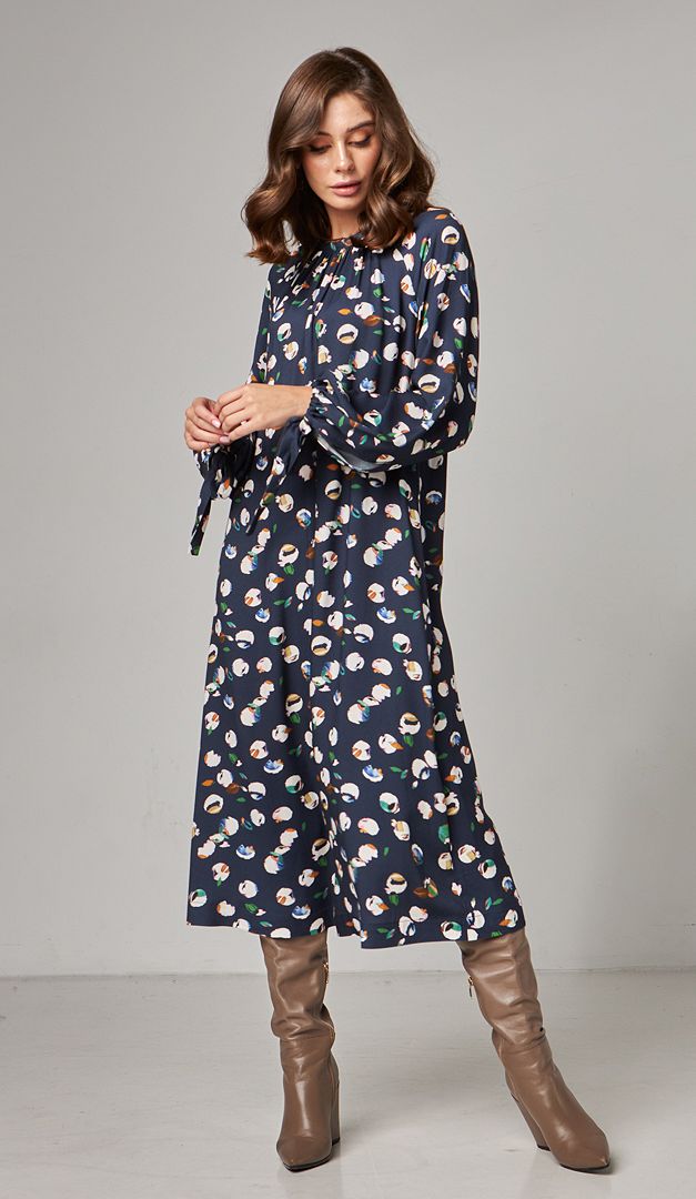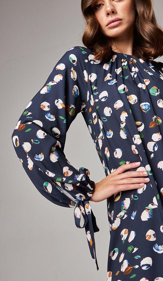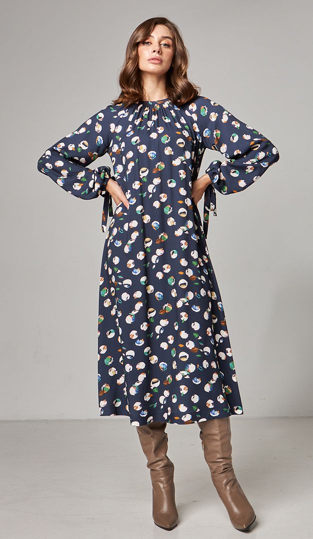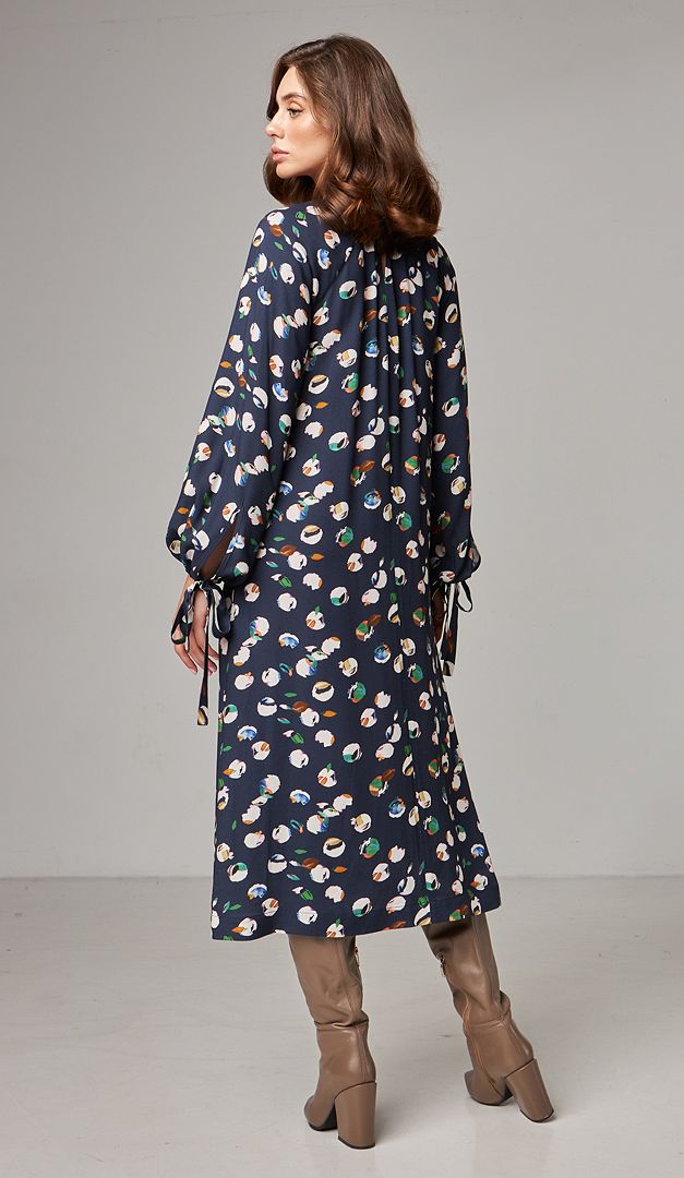 Сукня трапеція з принтом синя додасть Вашому образу легкості та граційності. Модель вільного розкльошеного до низу крою, з неглибоким округлим вирізом горловини та довгим широким рукавом. Сукня трапеція з принтом синя виконана з 100% віскозної тканини, що забезпечує комфорт та зручність. Ззаду виріб застібається на один ґудзик, а низ рукавів оформлений шнурівкою, завдяки якій він зручно фіксується створюючи елегантний об'єм. Модель без підкладки.