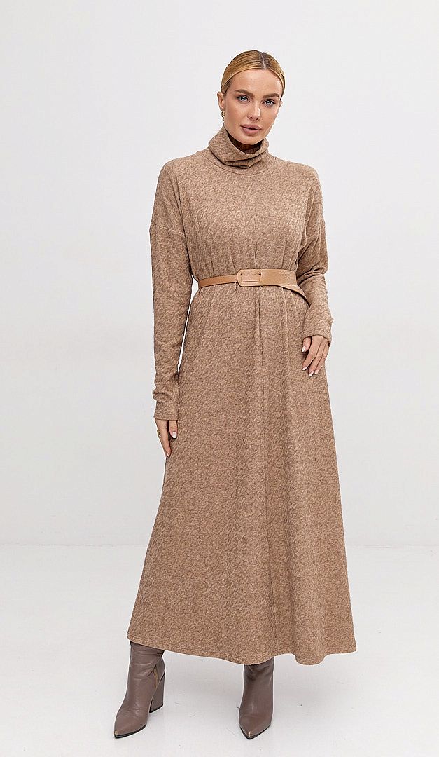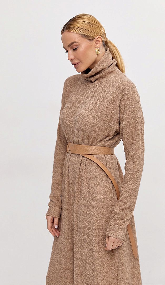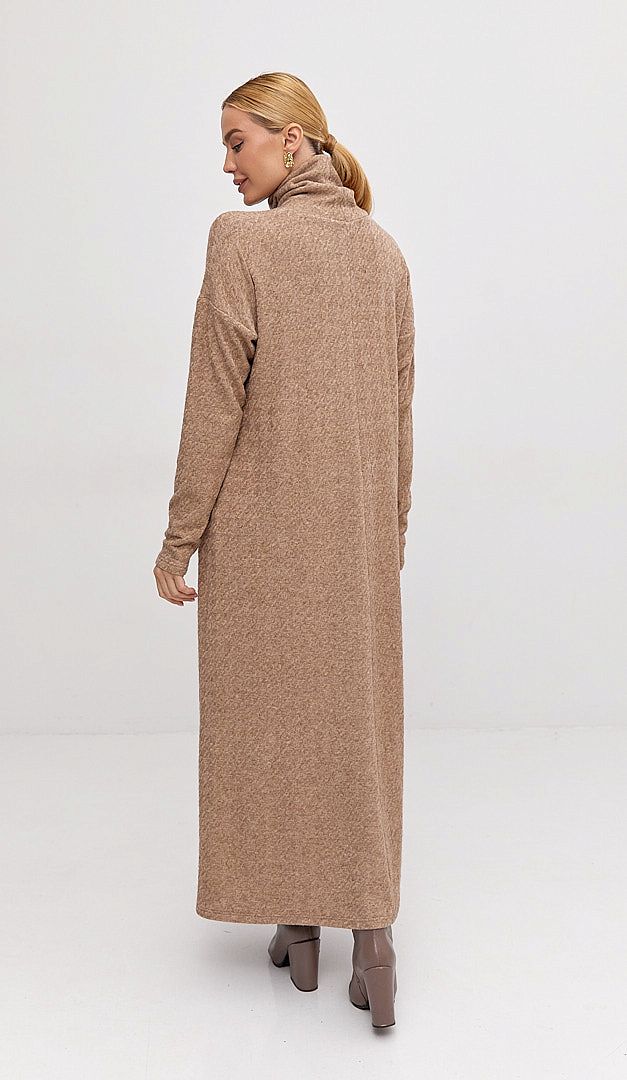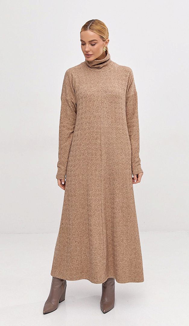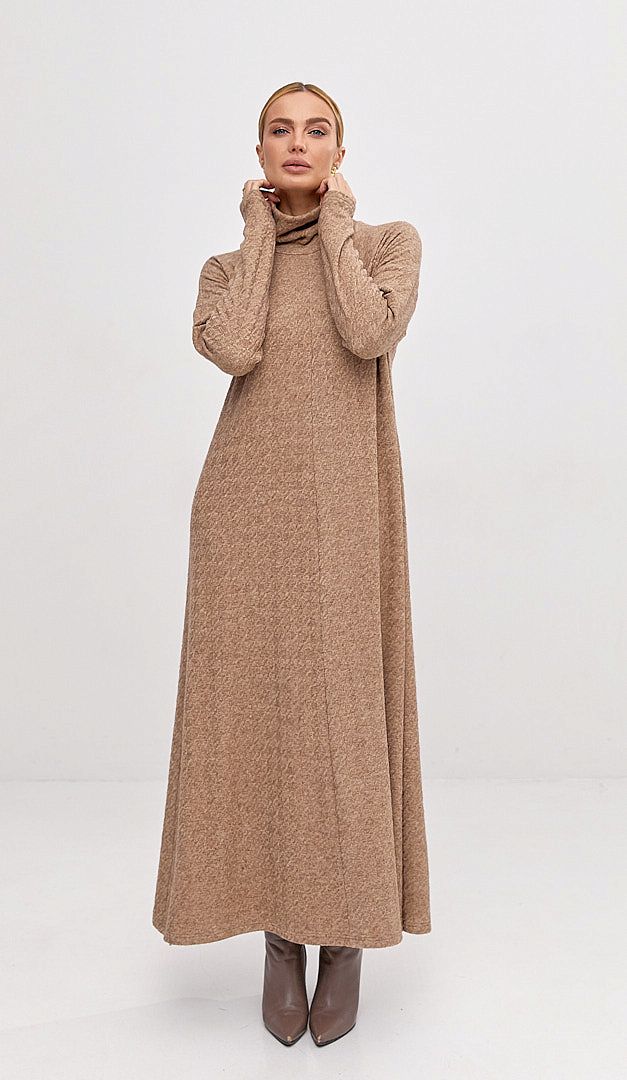 Сукня трикотажна максі карамельна — базова річ для жіночого гардеробу в холодний сезон. Модель А-подібного силуету, з об'ємним коміром-стійкою та довгим рукавом, що має приспущену лінію плеча. Сукня трикотажна максі карамельна виконана із м'якого трикотажу з рельєфним візерунком. Завдяки мінімалістичному дизайну та універсальному монохромному кольору, виріб стане вдалим вибором для створення щоденних затишних образів. Без підкладки та застібок.