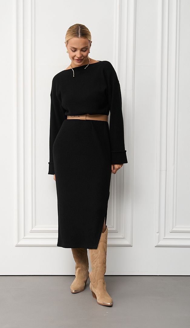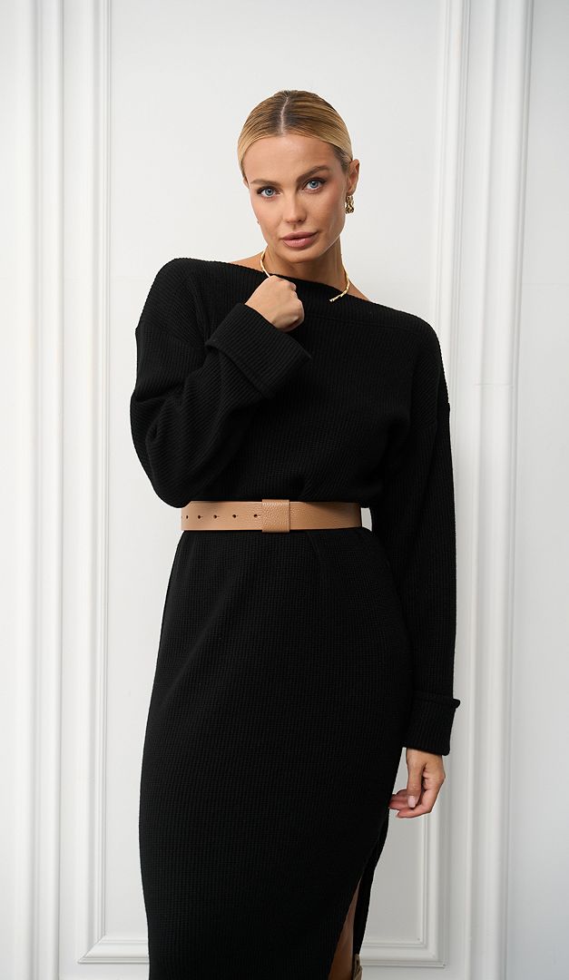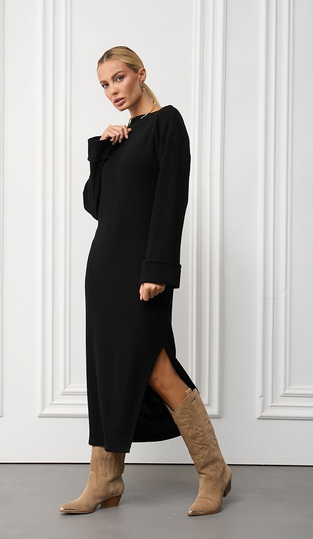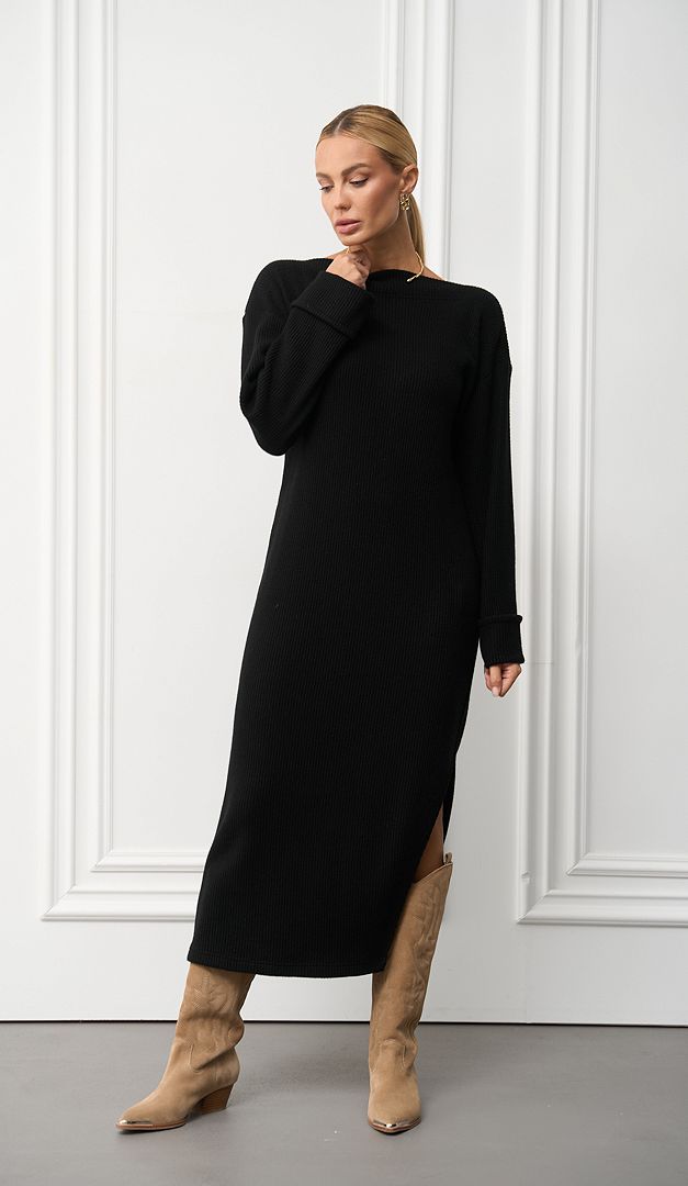Сукня трикотажна з розрізом міді чорна — затишна базова річ для прохолодного сезону. Модель вільного прямого крою, з горловиною у формі “човник” і елегантною довжиною міді. Сукня трикотажна з розрізом міді чорна має довгий вільний рукав з широкою манжетою по низу. Жіночності створеному образу додає високий розріз по одному з бокових швів. А м'яка трикотажна тканина забезпечить тепло і комфорт навіть у самий холодний день.