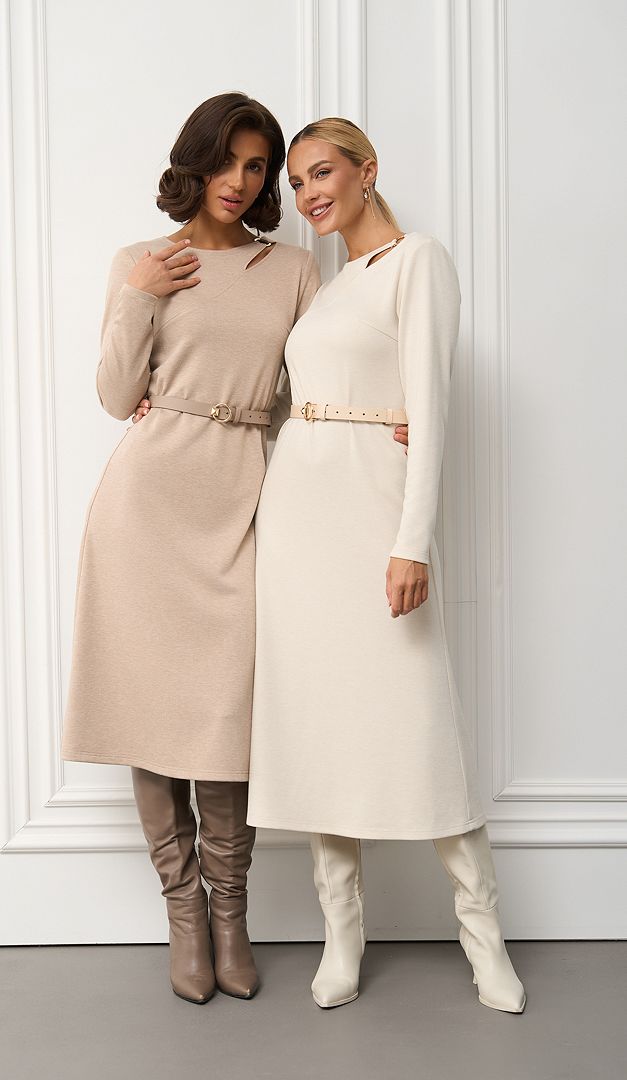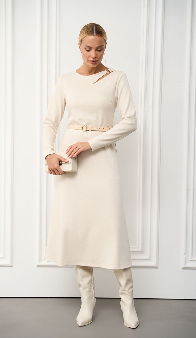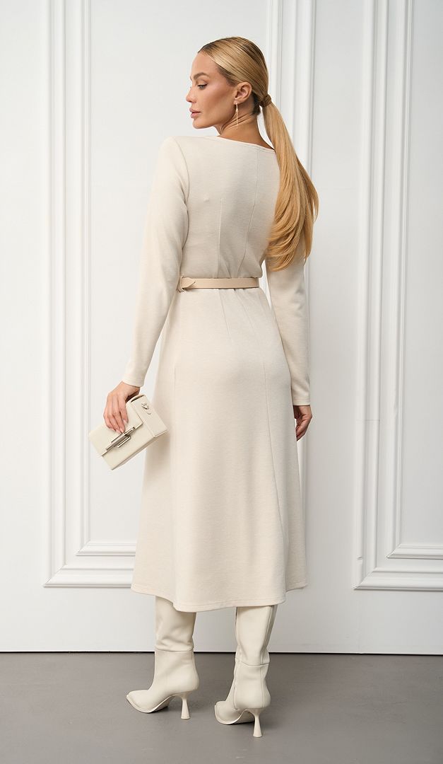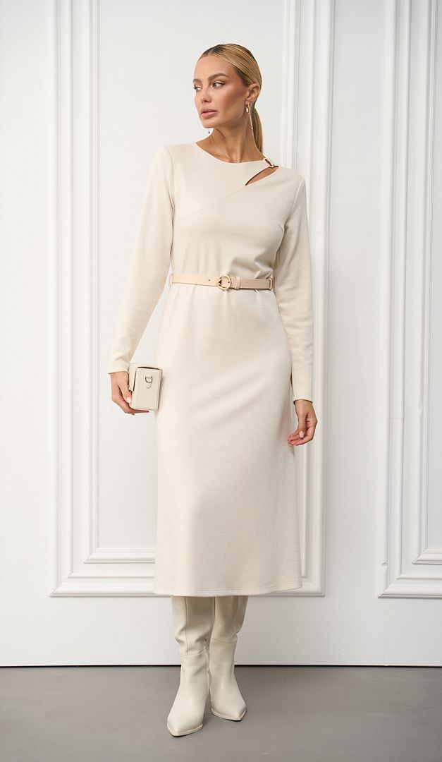 Сукня трикотажна з вирізом молочна — комфортне та стильне рішення для базового жіночого гардеробу. Модель має зручний А-подібний крій, неглибокий округлий виріз горловини, який оформлений оригінальним вирізом з декором і довгий звужений до низу рукав. Сукня трикотажна з вирізом молочна виконана з елегантною довжиною міді та на поясі оформлена додатковими петлями для паска, що дає можливість стилізувати образ та підкреслити стрункість жіночого силуету.