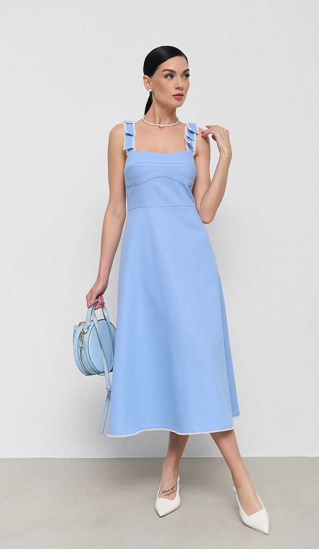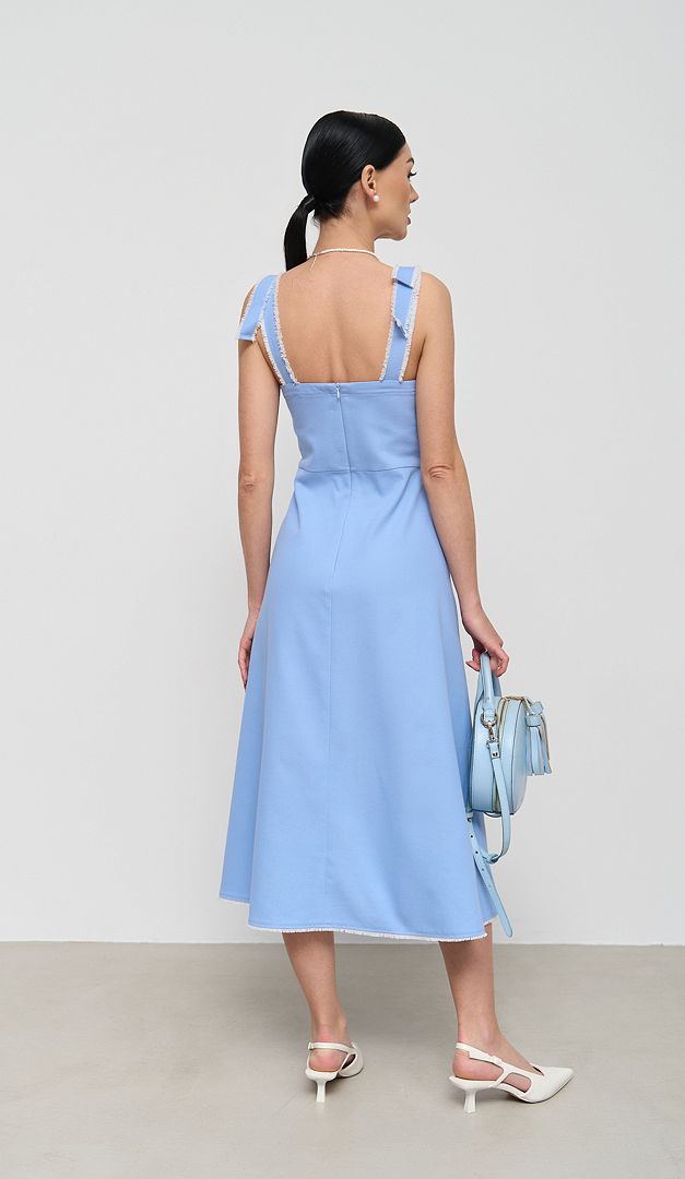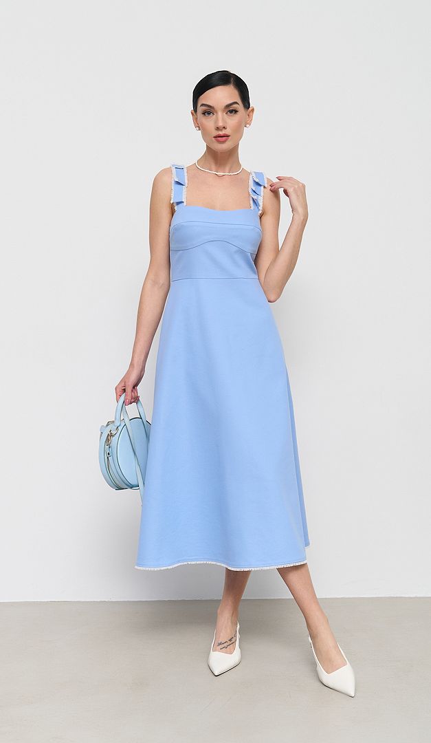 Сарафан літній джинсовий блакитний — саме та річ, яка додасть жіночності до літнього гардеробу та підкорить своєю практичністю. Модель зручного А-подібного силуету, з відкритою горловиною та широкими бретелями-бантами, що роблять акцент на витонченості жіночої шиї та плечей. Сарафан літній джинсовий блакитний виконаний з оригінальним ліфом, що підкреслює фігуру, функціональними кишенями в бокових швах спідничної частини і застібається на потайну “блискавку” розташовану в середньому шві спинки. Бретельки не регулюються. Без підкладки.