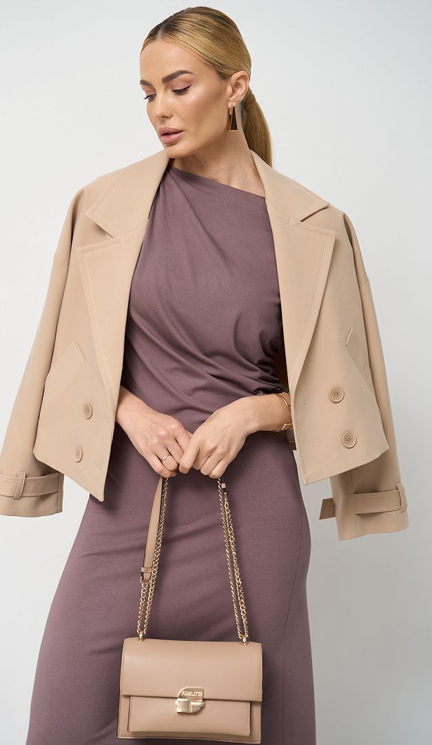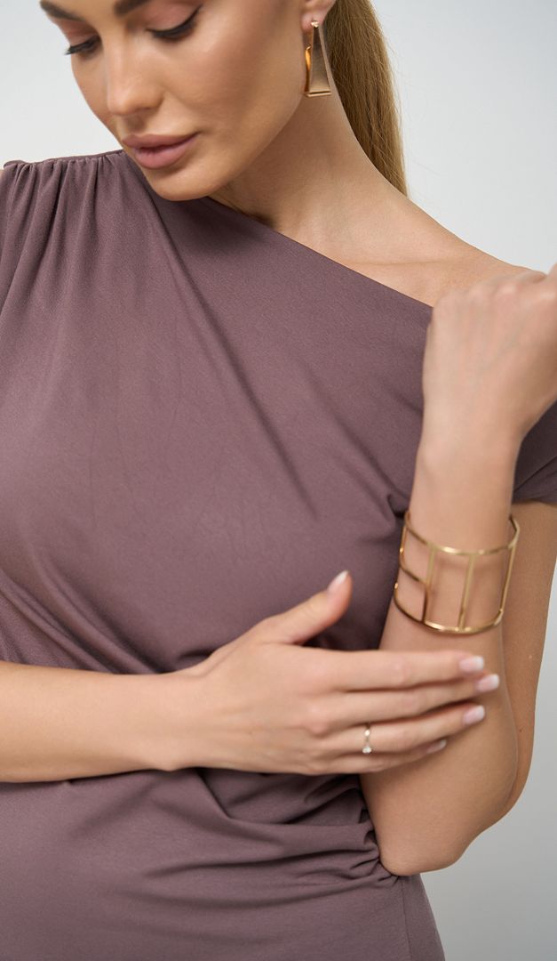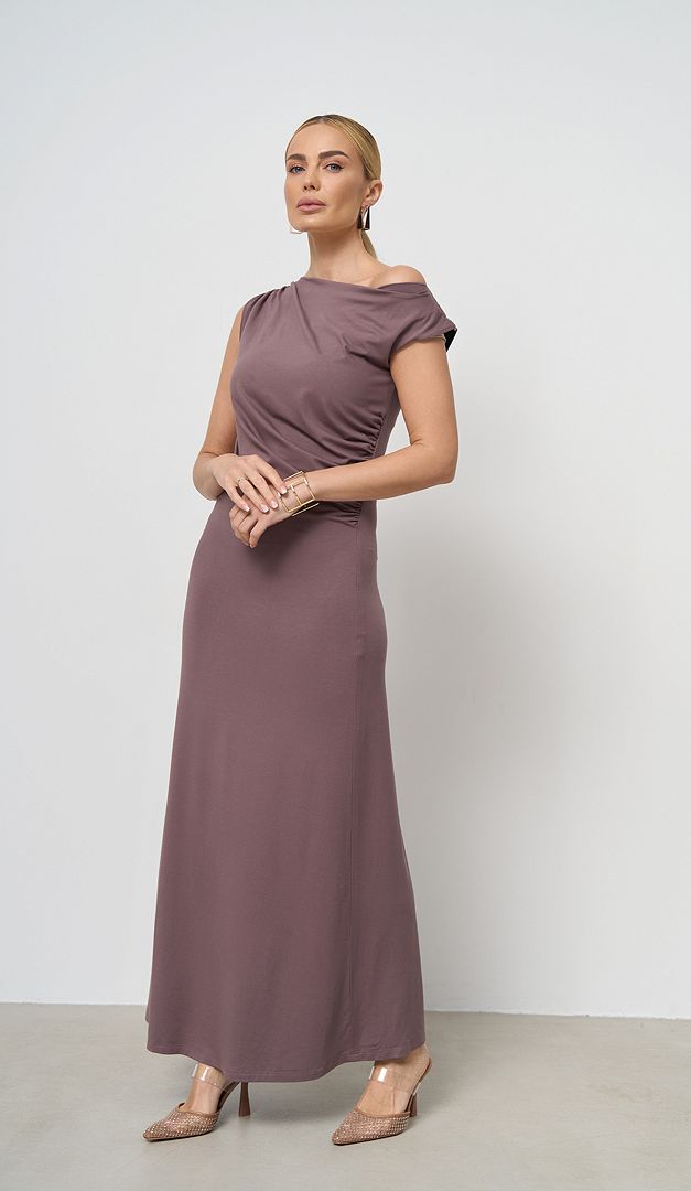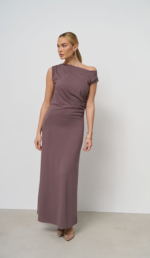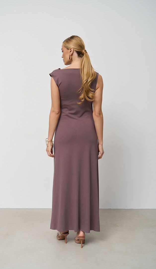 Сарафан літній максі кольору какао — елегантна базова річ для жіночого гардеробу. Модель розширеного до низу крою, з неглибоким вирізом горловини та зручною проймою рукавів. Сарафан літній максі кольору какао оформлений драпіруванням на правому плечі та по боковому шву зліва, що додає виробу оригінальності та стилю. Модель має трендову довжину максі та універсальний колір, що вдало виглядатиме, як для щоденних офісних луків, так і в аутфітах для прогулянок або відпочинку. Сарафан зверху має коротку підкладку.