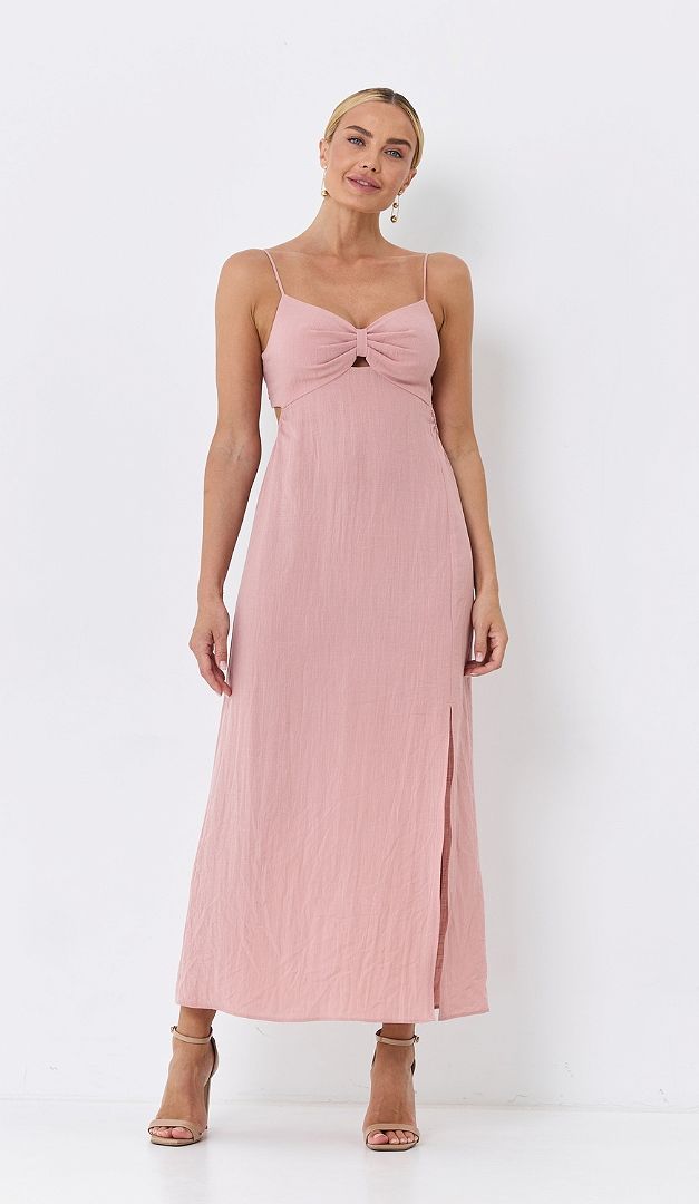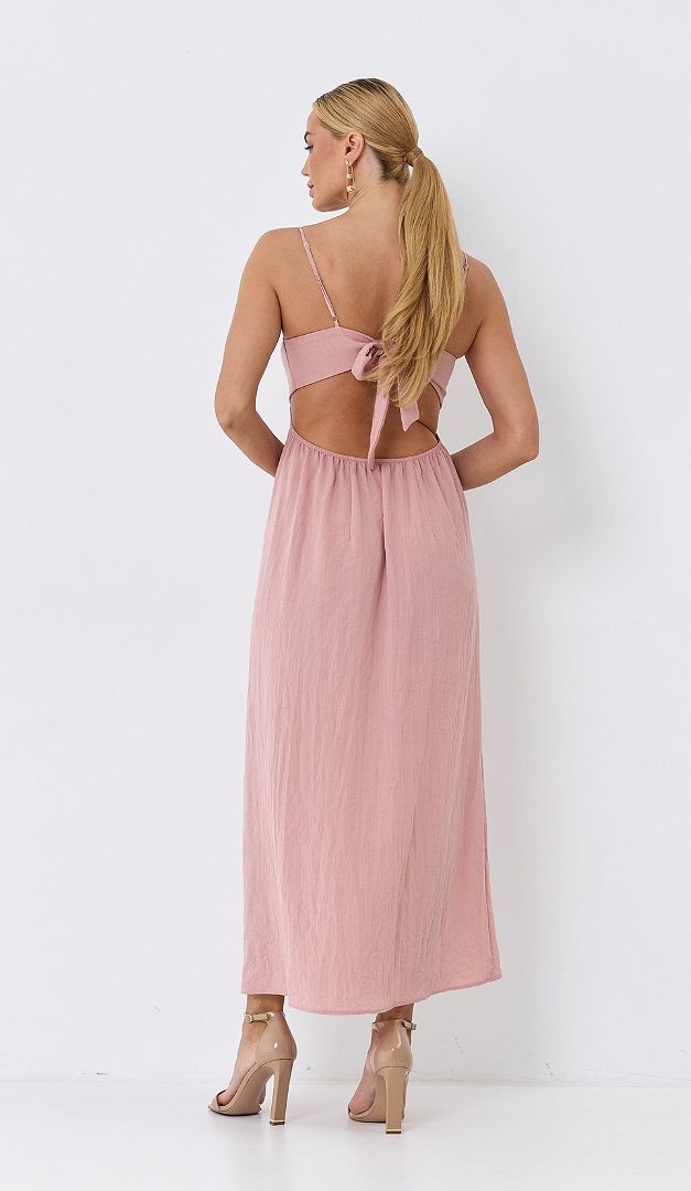 Справжня знахідка для спекотної пори — сарафан літній максі пудровий! Верх моделі оформлений вузькими регульованими бретельками та красивим фігурним ліфом, який зав'язується ззаду. Сарафан літній максі пудровий має глибокий спокусливий виріз спинки, що для більшої зручності, по краю виконаний з тонкою еластичною резинкою. Вільний крій спідничної частини та висока розпірка з одного боку додають виробу романтичності та жіночності. Без застібок та підкладки.