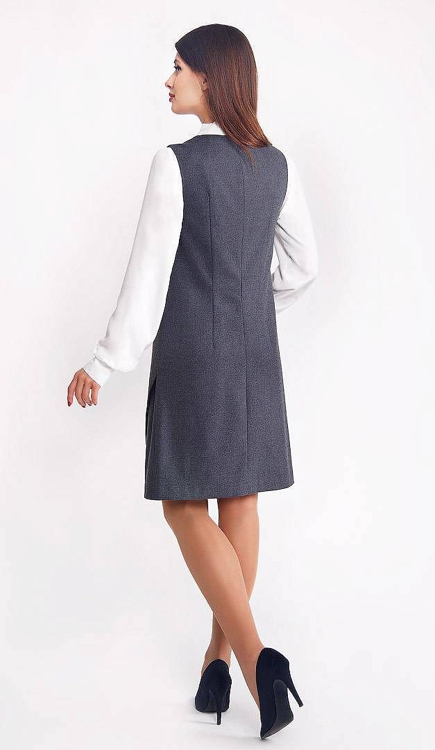 Сарафан Лівія допоможе Вам створити новий класичний образ з кокетливими грайливими нотками. Саме в цьому сарафані Ви будете відчувати себе максимально комфортно завдяки просторому трапецієподібному силуету, приховує всі недоліки. Прихильниці оригінальних речей оцінять незвичайну асиметричну передню частину з ефектом «запаху». Також сарафан Лівія оригінально доповнений діагональними рельєфами і функціональною внутрішньою кишенею з клапаном. Акуратний неглибокий виріз горловини ідеальний для комбінування з різними блузами. Сарафан Лівія зсередини — на підкладці. Застібається на «блискавку», розташовану в середньому шві задньої частини.
