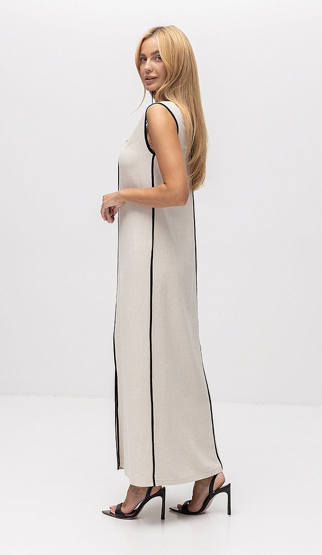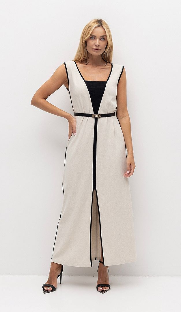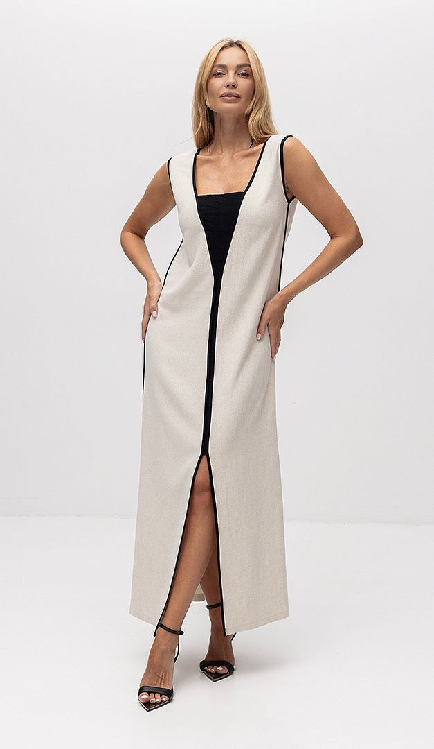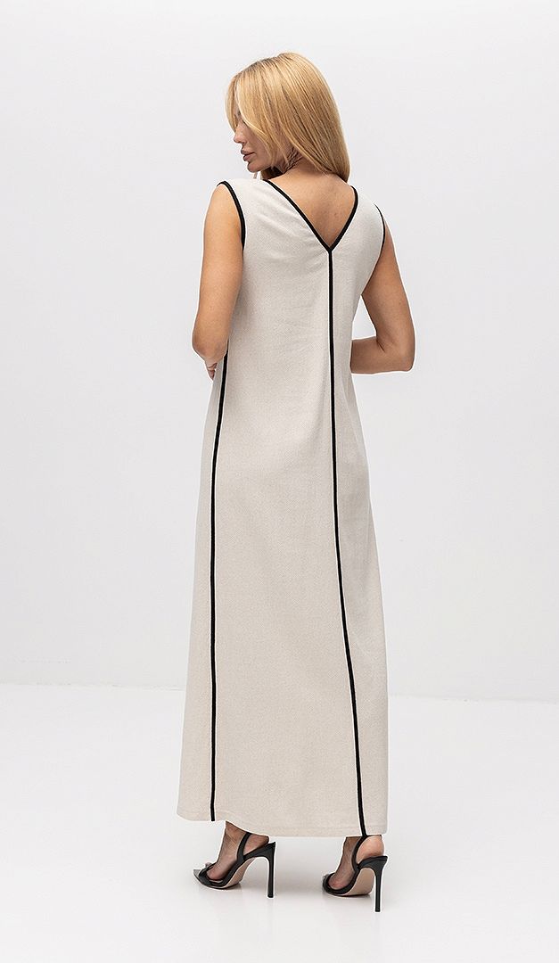 Сарафан максі літній льон – ідеальне рішення для літнього гардеробу. Модель напіввільного злегка розкльошеного до низу крою, з трендовою довжиною максі та оригінальним V-подібним вирізом горловини і спинки. Сарафан максі літній льон за рахунок контрастної вертикальної вставки по центру та аналогічного окантування з боків додає жіночому силуету стрункості та виразності. А високий розріз по центру переду підкреслює жіночність. Без підкладки і застібок.
