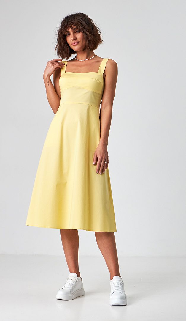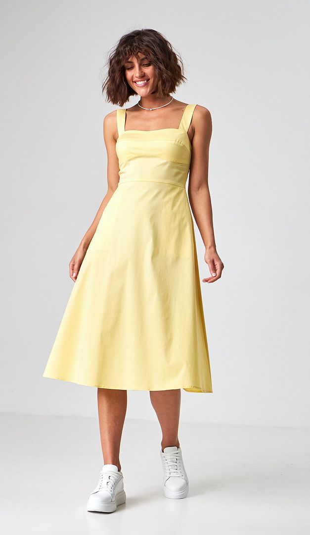Неймовірно жіночний та кокетливий сарафан на бретелях жовтий — ідеальний варіант для літніх образів з босоніжками, кедами, або улюбленими човниками. Модель зручного А-подібного силуету, з відкритою горловиною та широкими бретелями, що додають акцентності на витонченості жіночої шиї та плечей. Сарафан на бретелях жовтий виконаний з оригінальним ліфом, що підкреслює фігуру, функціональними кишенями в бокових швах спідничної частини і застібається на потайну “блискавку” розташовану в середньому шві спинки. Без підкладки.