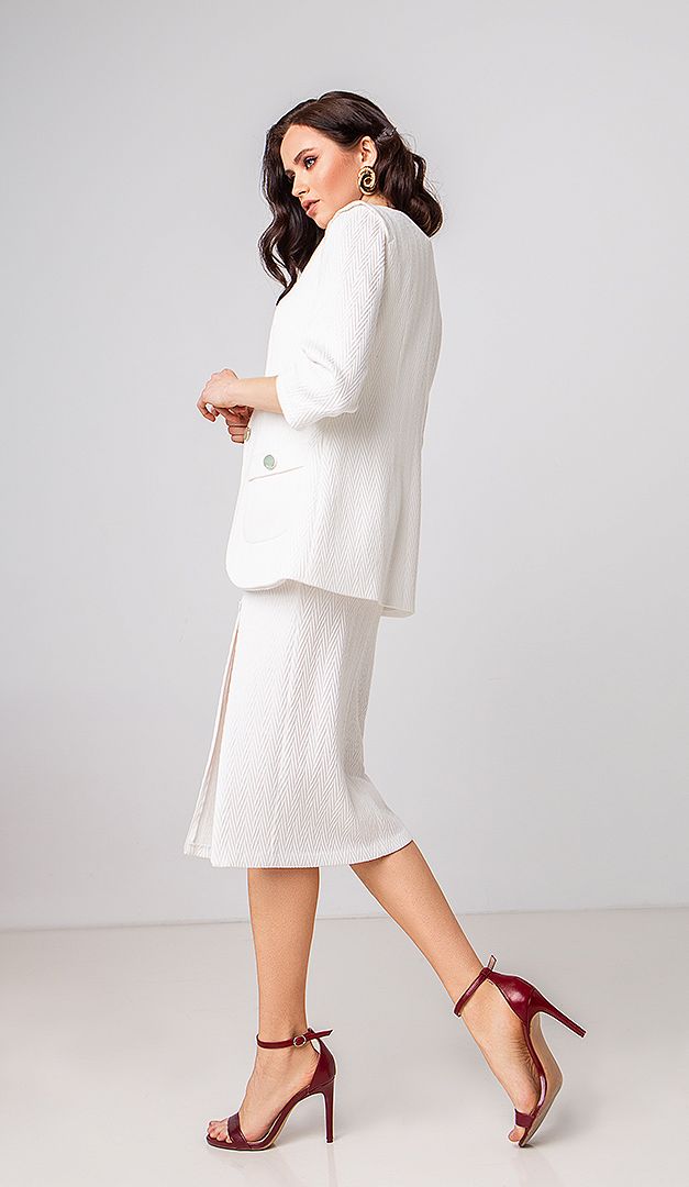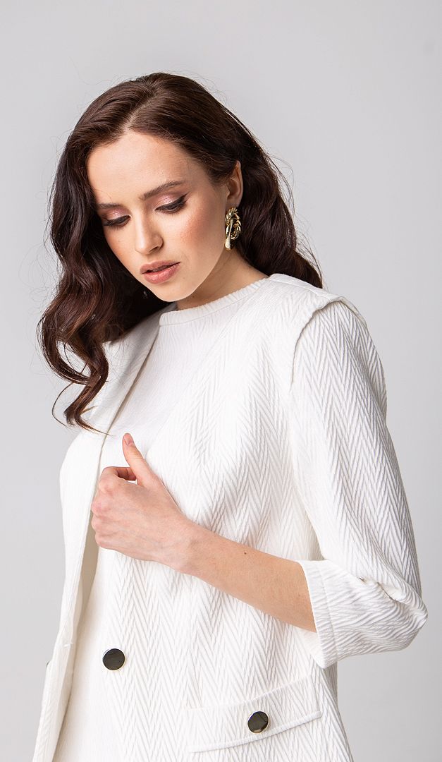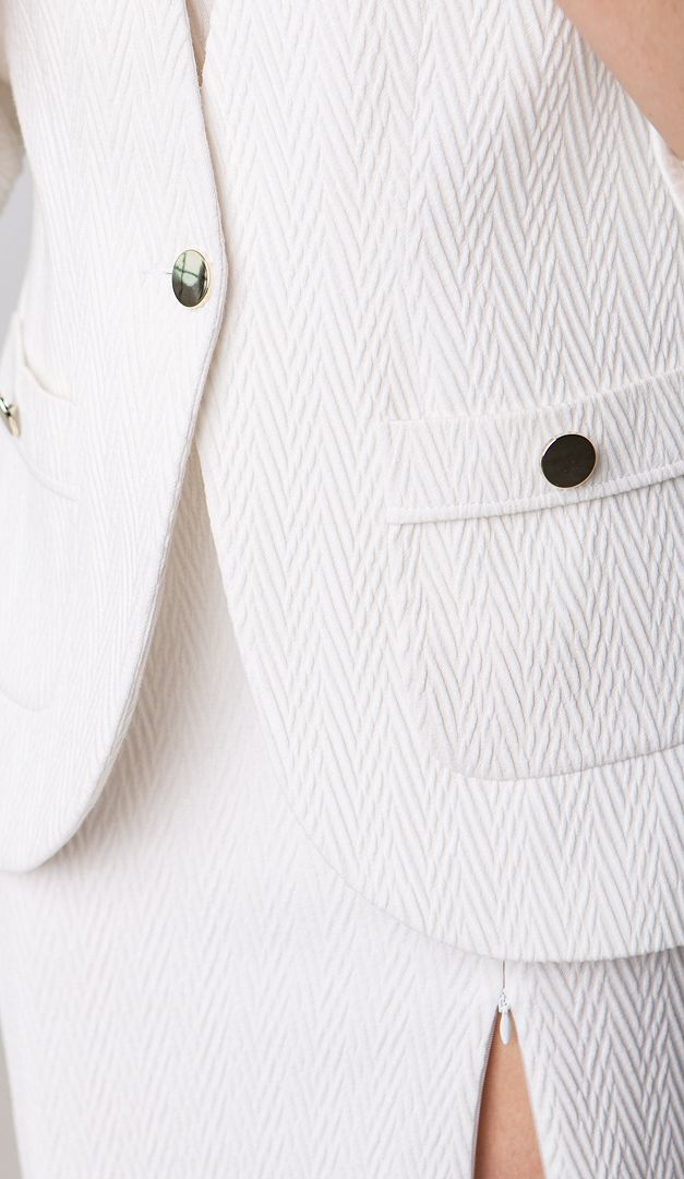 Для шикарного образу, для святкових подій або ж, коли просто хочеться нових свіжих фарб — рекомендуємо жакет білий! Ця класична модель має прямий напівприлеглий силует з округлими бортами. Білий жакет виготовлений з фактурного матеріалу, який не мнеться. Ідеальний на спекотну погоду (90% бавовна). V-подібний виріз горловини, що переходить в застібку на один ґудзик, витончено виконаний без звичного відкладного коміра. Спереду білий жакет доповнений функціональними накладними кишенями. Рукав — прямий, укорочений. Виріб зсередини на підкладці.