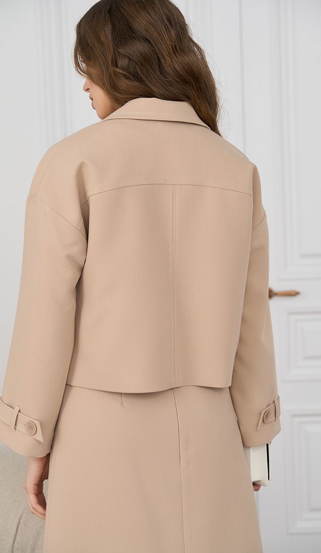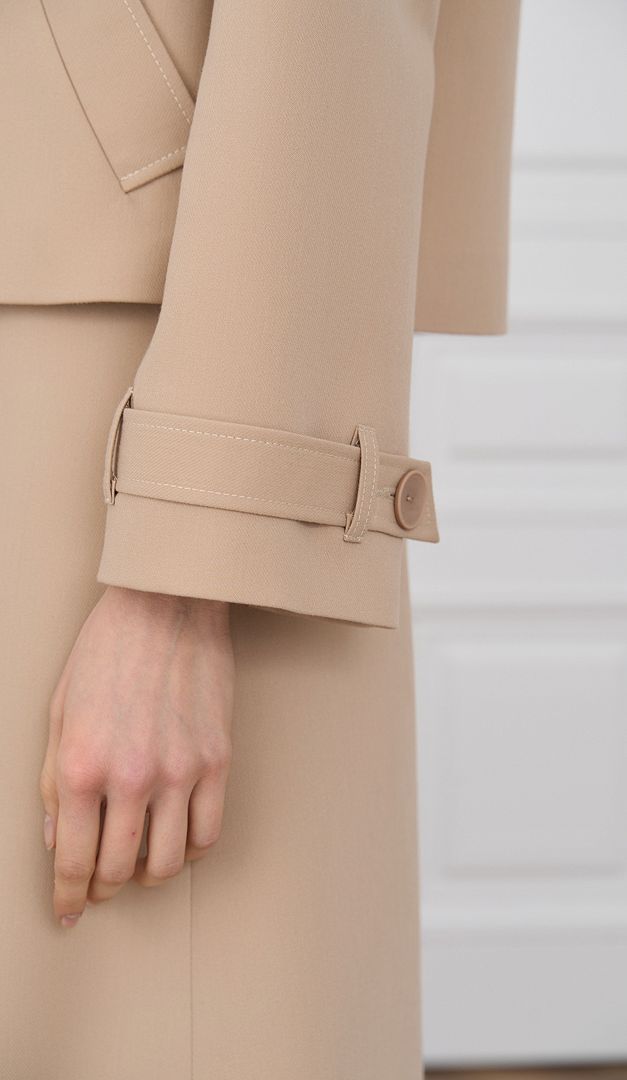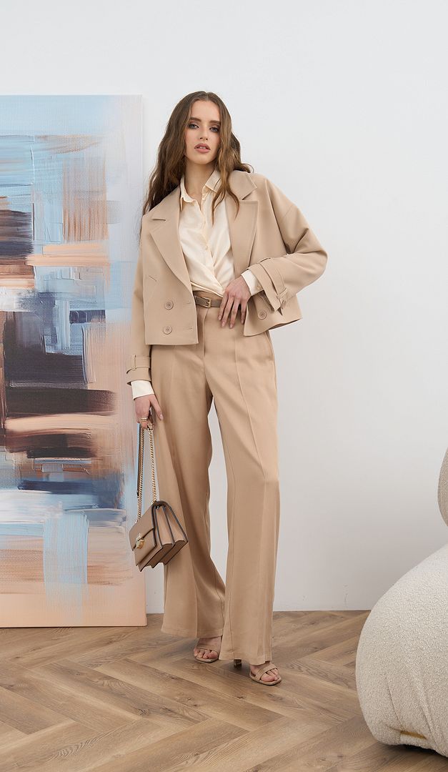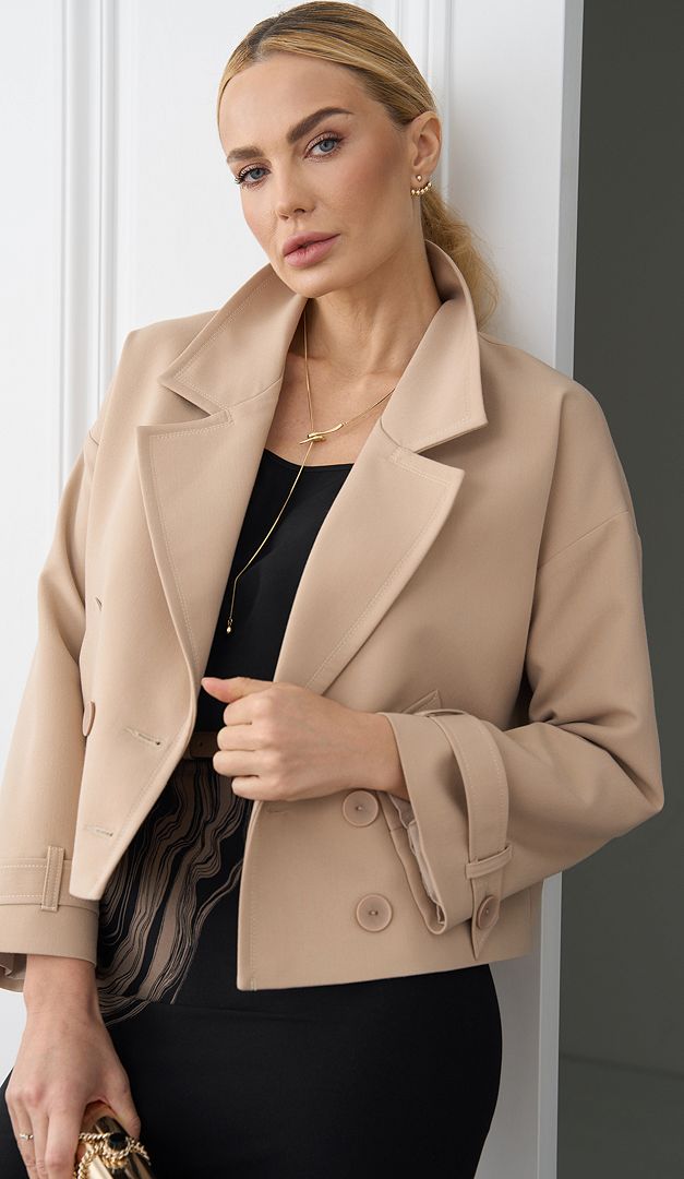 Жакет жіночий прямий бежевий — базова річ, яка допоможе створити стильні трендові образи. Модель вільного прямого крою, з V-подібним вирізом, який оформлений оригінальним відкладним коміром з фігурними бортами. Жакет жіночий прямий бежевий має приспущену лінію плеча та довгий вільний рукав, який знизу доповнений декоративною планкою з застібкою на ґудзик. Перед моделі виконаний з двома функціональними прорізними кишенями, оформленими широкими планками. Жакет застібається на практичну двобортну застібку на ґудзики. Виріб на підкладці.