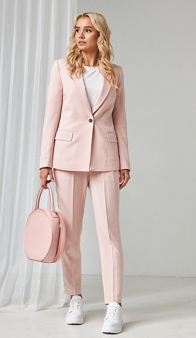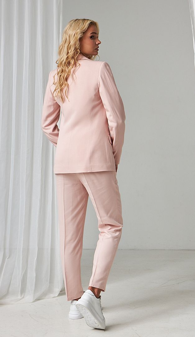 Для стильного монохромного луку рекомендуємо жакет комбінувати з жилетом класичним рожевим (арт.2685), брюками жіночими звуженими рожевими (арт.1878) з аналогічної тканини та футболкою базовою молочною (арт.1728).