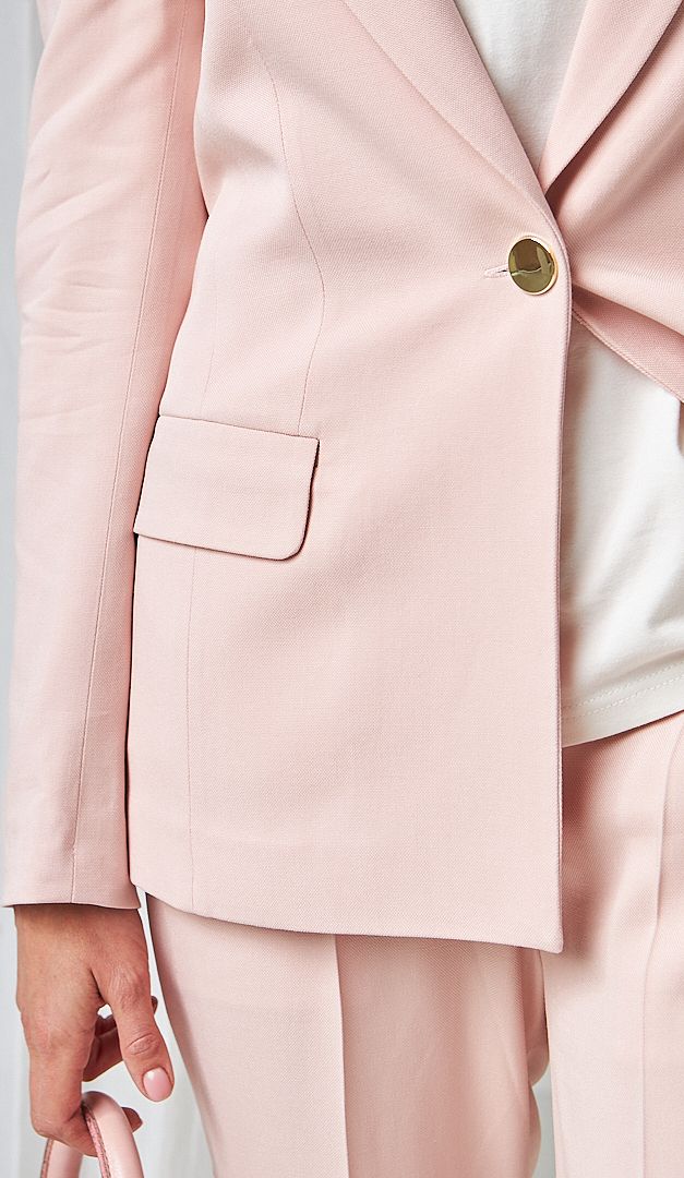 Жакет жіночий рожевий — універсальна річ для створення щоденних офісних образів та аутфітів у стилі casual у весняно-літньому сезоні. Модель має прямий напіввільний крій, V-подібний виріз з акуратними лацканами і довгий рукав. Жакет жіночий рожевий спереду доповнений функціональними внутрішніми кишенями з клапанами і застібається на один ґудзик. Виріб зсередини на підкладці.