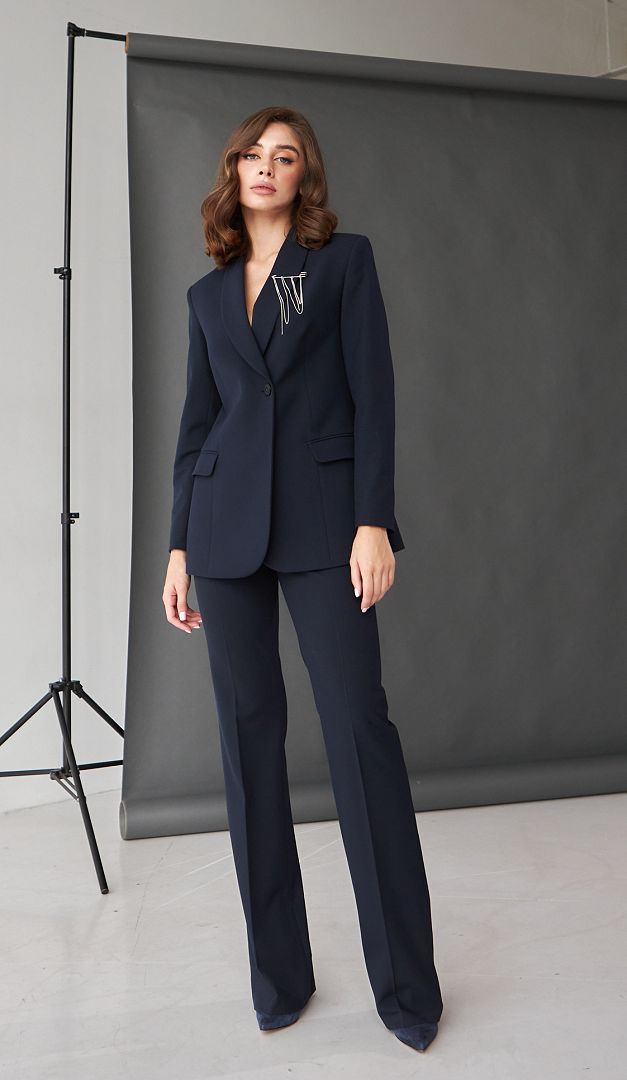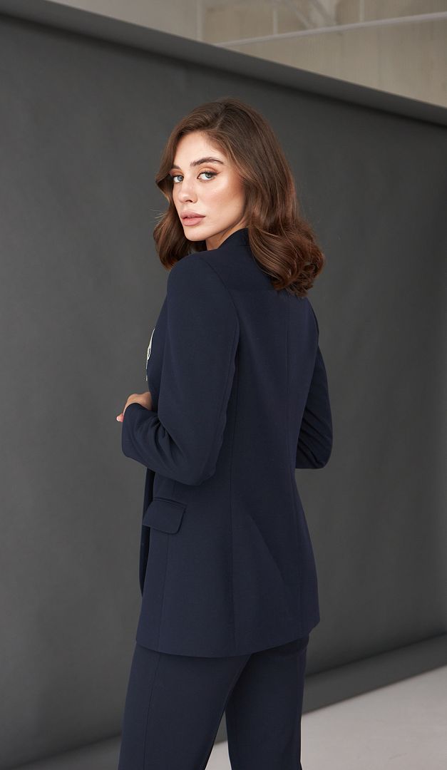 Для створення завершеного образу, рекомендуємо жакет комбінувати з брюками кльош жіночими синіми з аналогічної тканини (арт.1973)