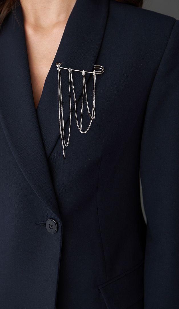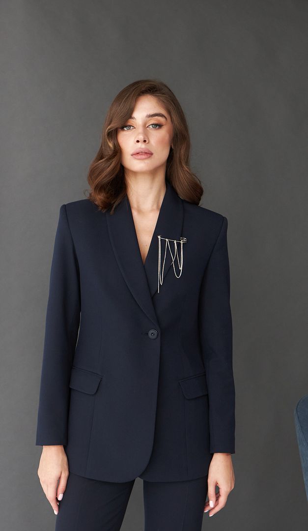 Для стильних класичних образів ідеальною базою стане жакет жіночий синій з прикрасою. Виріб має прямий напіввільний крій, елегантний V-подібний виріз горловини з класичним відкладним коміром і зручну застібку на один внутрішній та один зовнішній ґудзики. Спереду жакет жіночий синій з прикрасою доповнений практичними функціональними кишенями з клапанами та оригінальною прикрасою на комірі, яку можна зняти за бажанням. З середини модель виконана з напіввіскозною підкладкою.