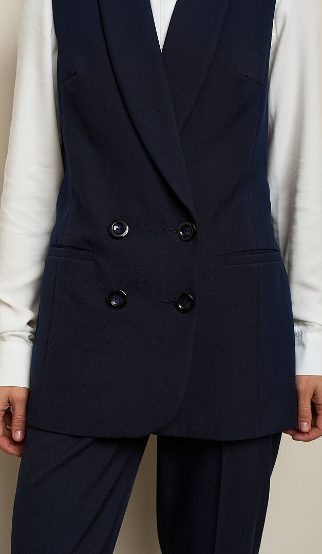 Жилет двобортний жіночий синій з поясом допоможе вам створити стильний і при цьому максимально комфортний образ. Прямий, злегка подовжений крій додасть візуальної стрункості силуету. Виріз горловини у виробі елегантно оформлений шалевим коміром, перехідним в застібку на ґудзики. Також жилет двобортний жіночий синій має внутрішні функціональні кишені і знімний тканинний пояс. Модель зсередини на підкладці.