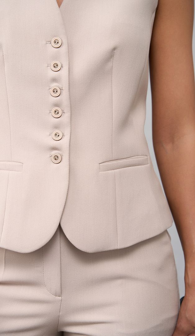 Жилет жіночий класичний бежевий, додасть стилю та трендовості у ваш базовий гардероб. Модель прилеглого крою, горловина оформлена V-подібним вирізом, що переходить у зручну застібку на ґудзики. Спереду жилет жіночий класичний бежевий доповнений двома функціональними кишенями. Лаконічність, універсальний колір та мінімалістичний дизайн виробу, дозволять комбінувати його з практично будь-якою блузкою, гольфом або топом з вашої шафи. Модель на підкладці.