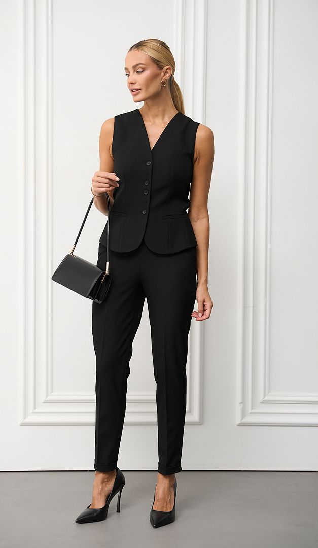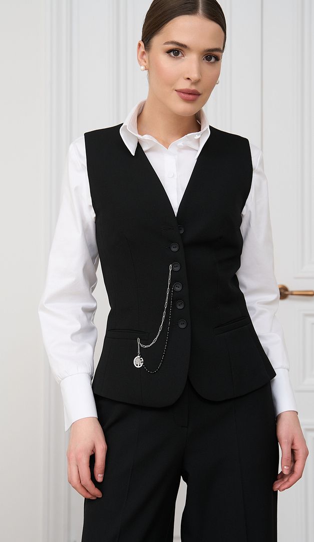 Елегантний жилет жіночий класичний чорний, неодмінно, знайде своє місце у вашому базовому гардеробі. Модель прилеглого крою, горловина оформлена V-подібним вирізом, що переходить у зручну застібку на ґудзики. Спереду жилет жіночий класичний чорний доповнений двома функціональними кишенями. Лаконічність, універсальний колір та мінімалістичний дизайн виробу, дозволять комбінувати його з практично будь-якою блузкою, гольфом або топом з вашої шафи. Модель на підкладці.