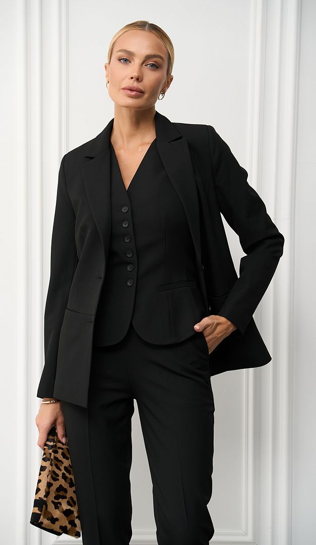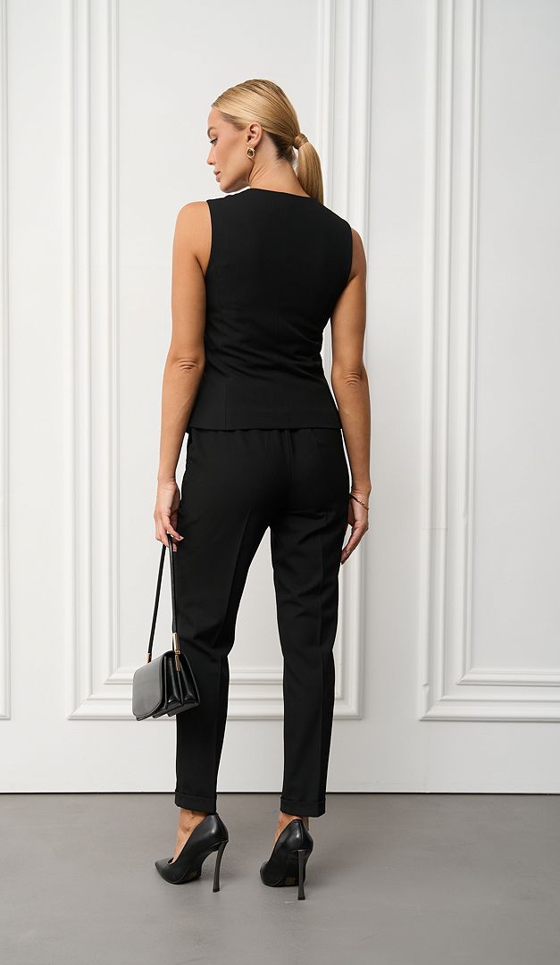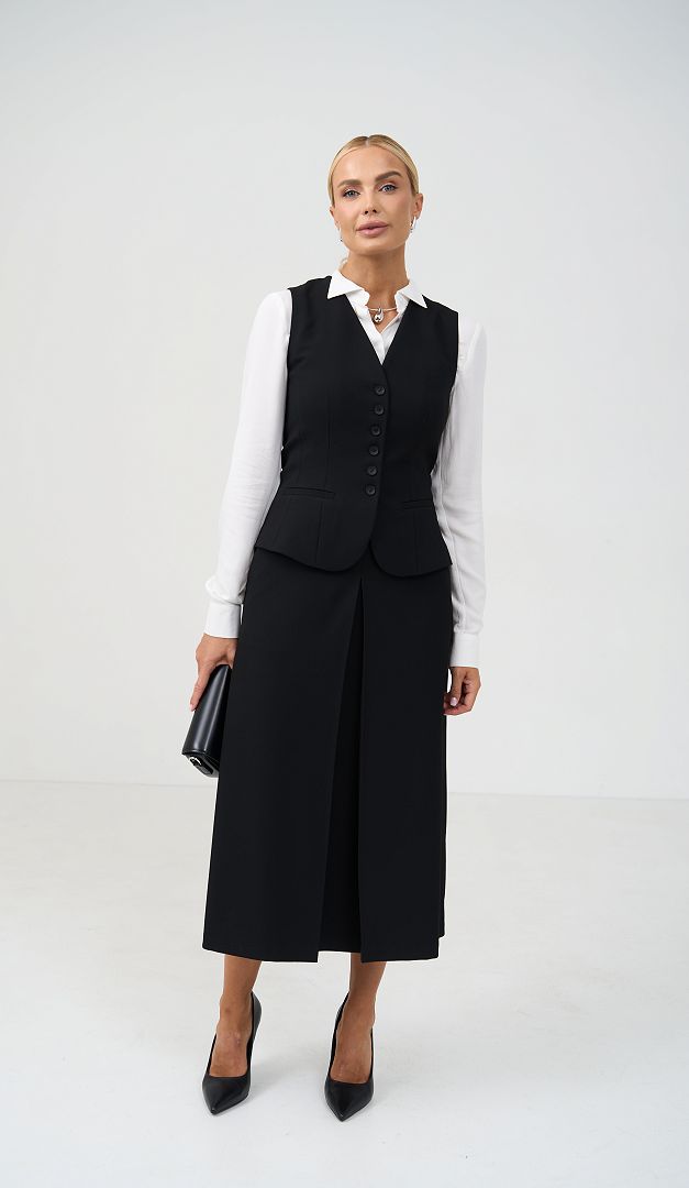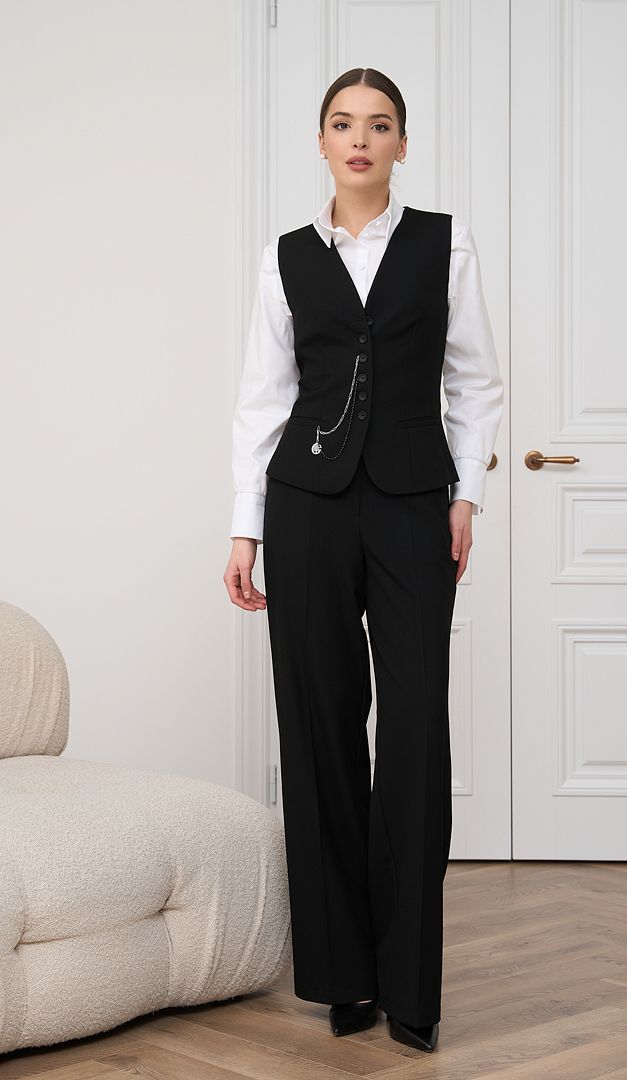 На фото створено луки з штанами прямими чорними (арт.2838) і блузкою базовою білою (арт.4007), спідницею трапеція міді чорною (арт.2738) і блузкою Кліко (арт.1517) та брюками завуженими чорними (арт.2387) і жакетом базовим чорним (арт.2389).