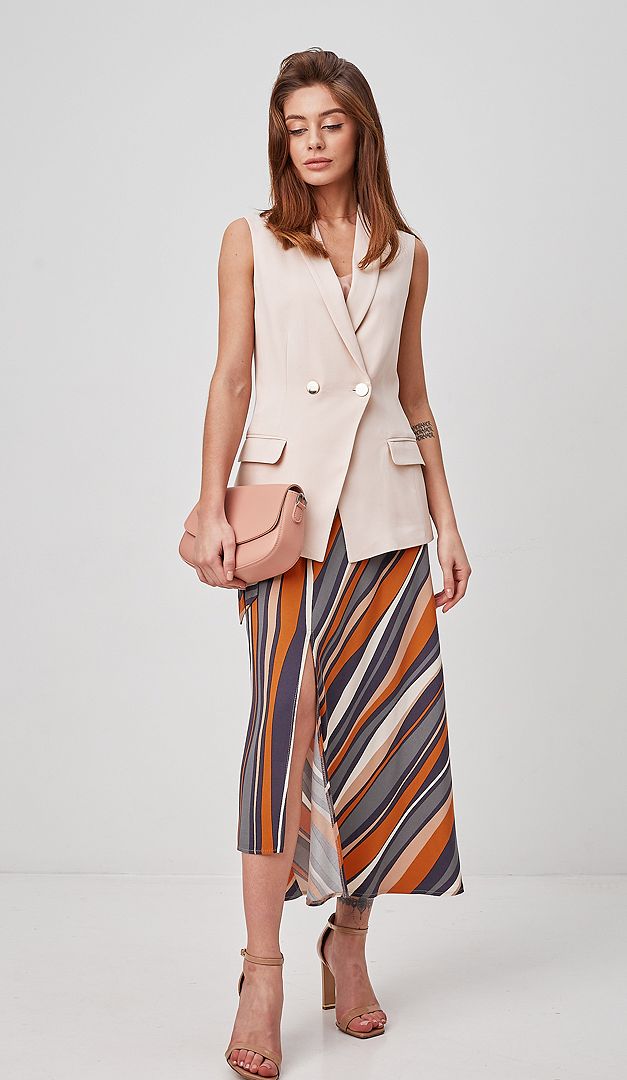 Для створення красивого літнього образу рекомендуємо жилет комбінувати з брюками палаццо пудровим (арт.1870) та спідницею міді в смужку (арт.1834).