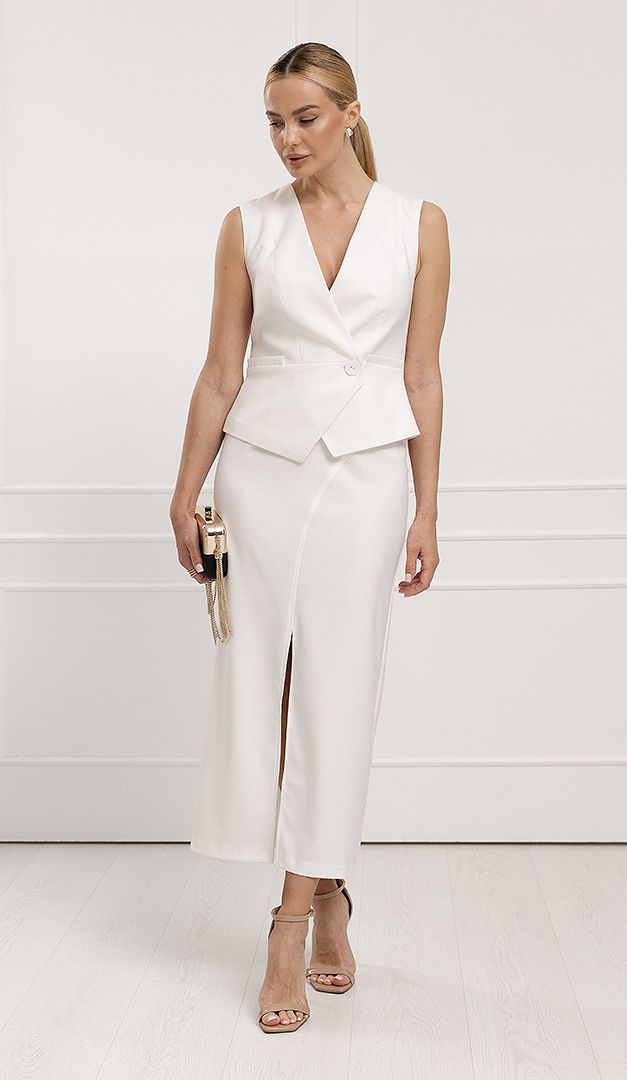 Жилет жіночий молочний – базовий елемент гардеробу для створення стильних образів. Модель приталеного крою, з глибоким V-подібним вирізом горловини і асиметричною двобортною застібкою на ґудзики. Жилет жіночий молочний оформлений натуральною підкладкою – віскоза 100%, яка забезпечить тілу комфорт. Ефектності виробу додає стильний фігурний низ та додаткові планки над відрізною лінією талії, що імітують кишені. Модель можна носити як самостійно, так і в поєднанні з топами.