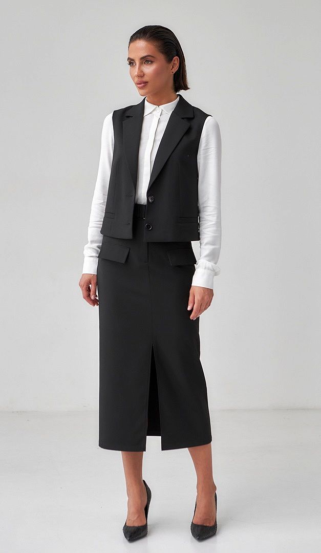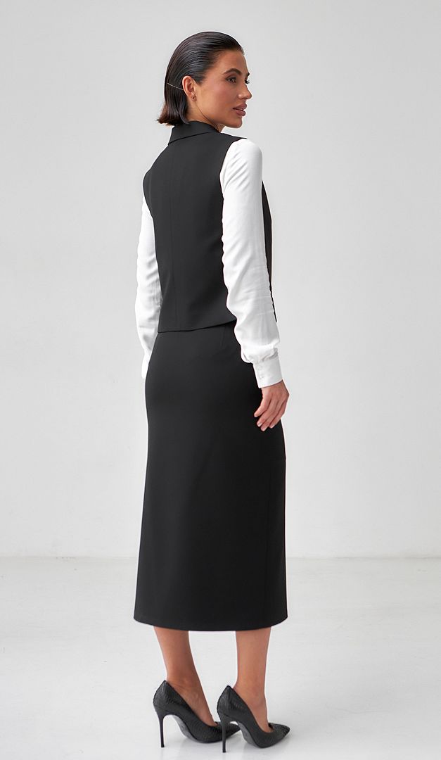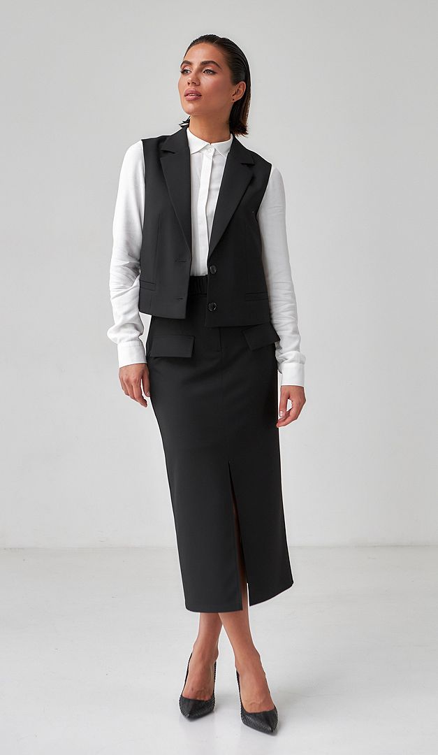 На фото створений лук з блузкою Кліко (арт.1517) та спідницею міді з розрізом чорною (арт.2430).