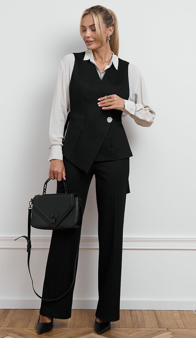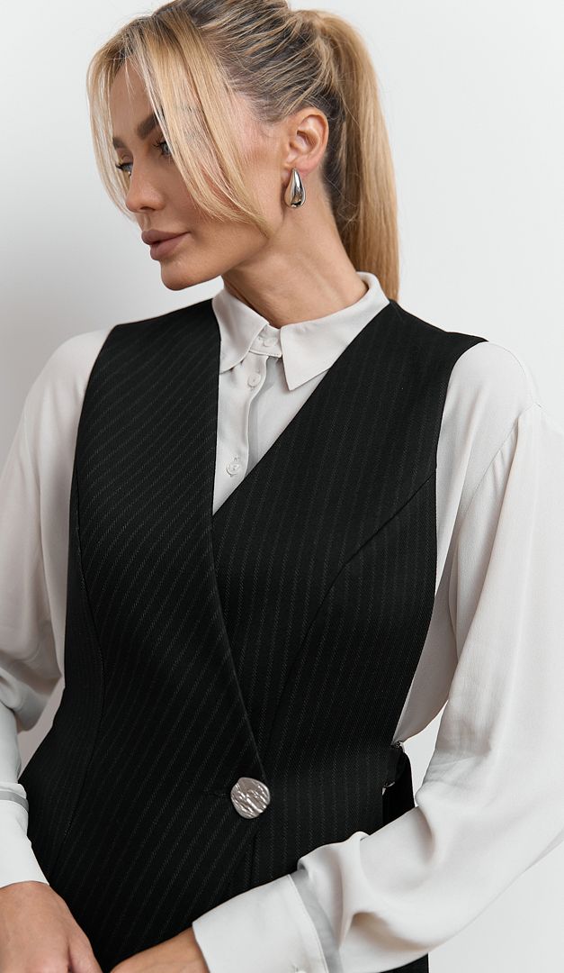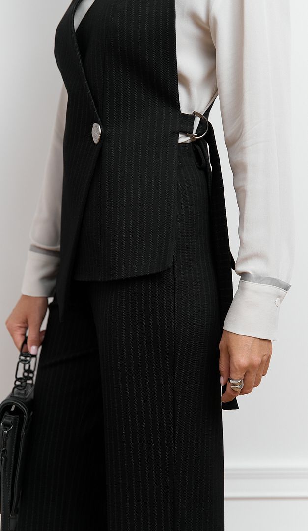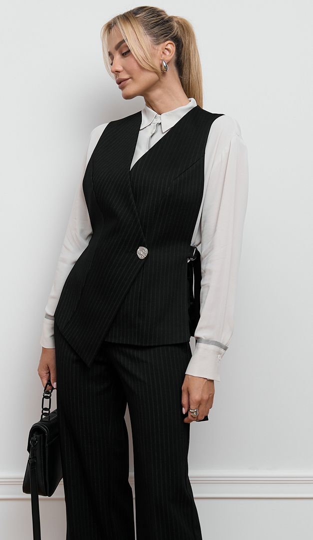Жилет жіночий в смужку чорний — це одна з найоригінальніших і стильних речей для базового і офісного гардеробу. Модель має оригінальний дизайн з асиметричною передньою та прямою задньою частинами і відкриті боки. V-подібний виріз горловини переходить в двобортну застібку на ґудзики. Жилет жіночий в смужку чорний з боків оформлений пасками з аналогічної тканини, завдяки яким можна коригувати виріб по фігурі. Модель на підкладці.