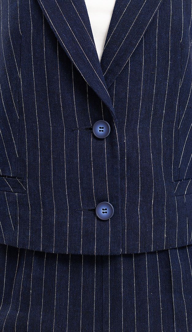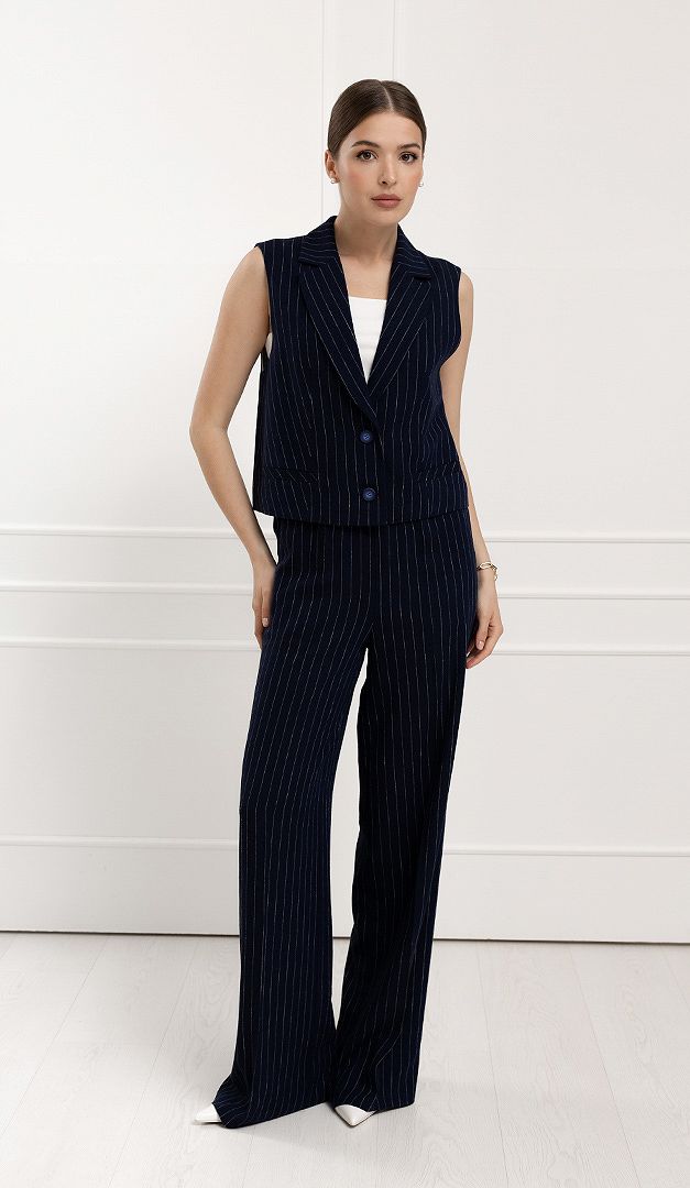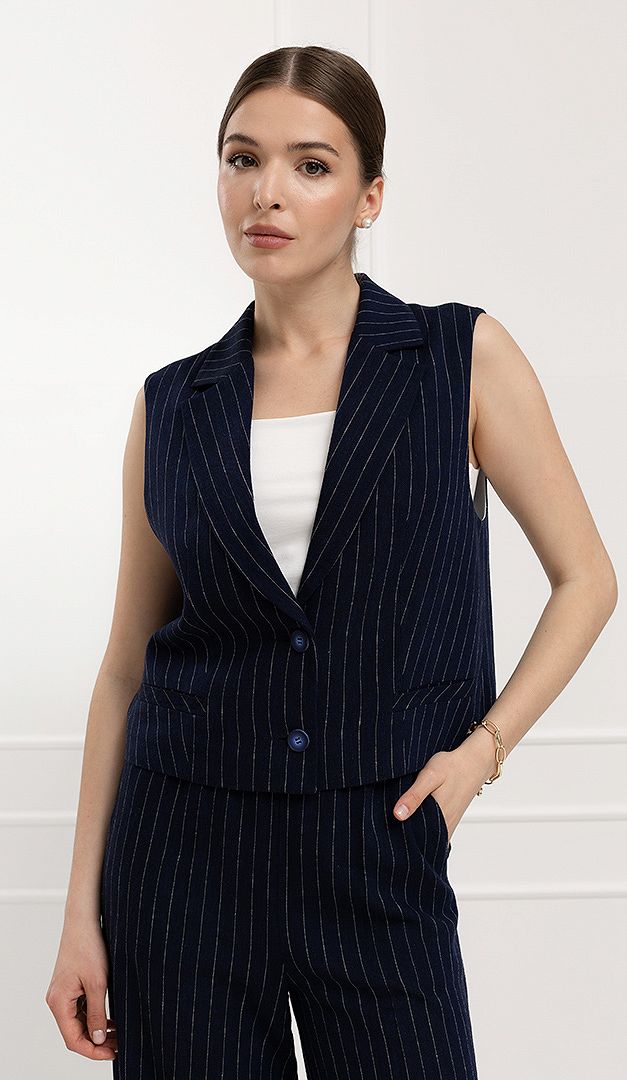 Жилет жіночий в смужку синій — стильна базова річ як для офісних луків, так і для образів у стилі casual. Модель прямого вкороченого крою, з глибоким V-подібним вирізом горловини, який оформлений фігурним відкладним коміром. Жилет жіночий в смужку синій має практичну застібку на два ґудзики і стилізований імітацією прорізних кишень. Виріб буде вдало комбінуватися з будь-якими топами й футболками та літніми спідницями і штанами включаючи денім. З натуральною підкладкою – бавовна 100%.