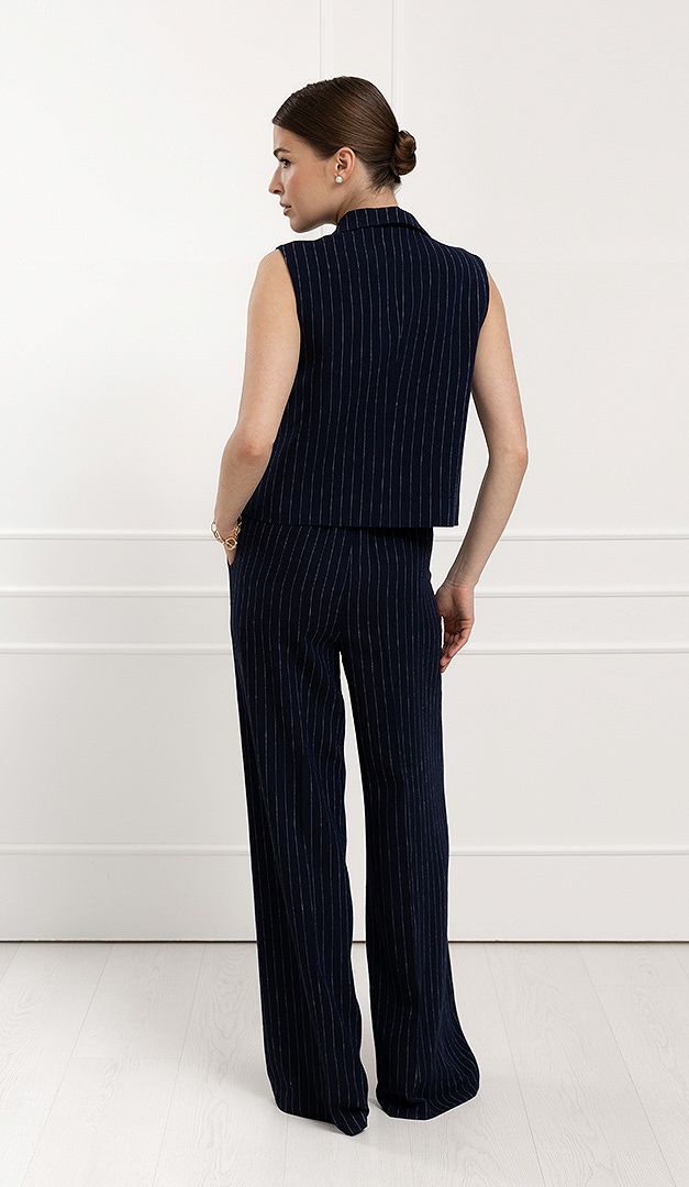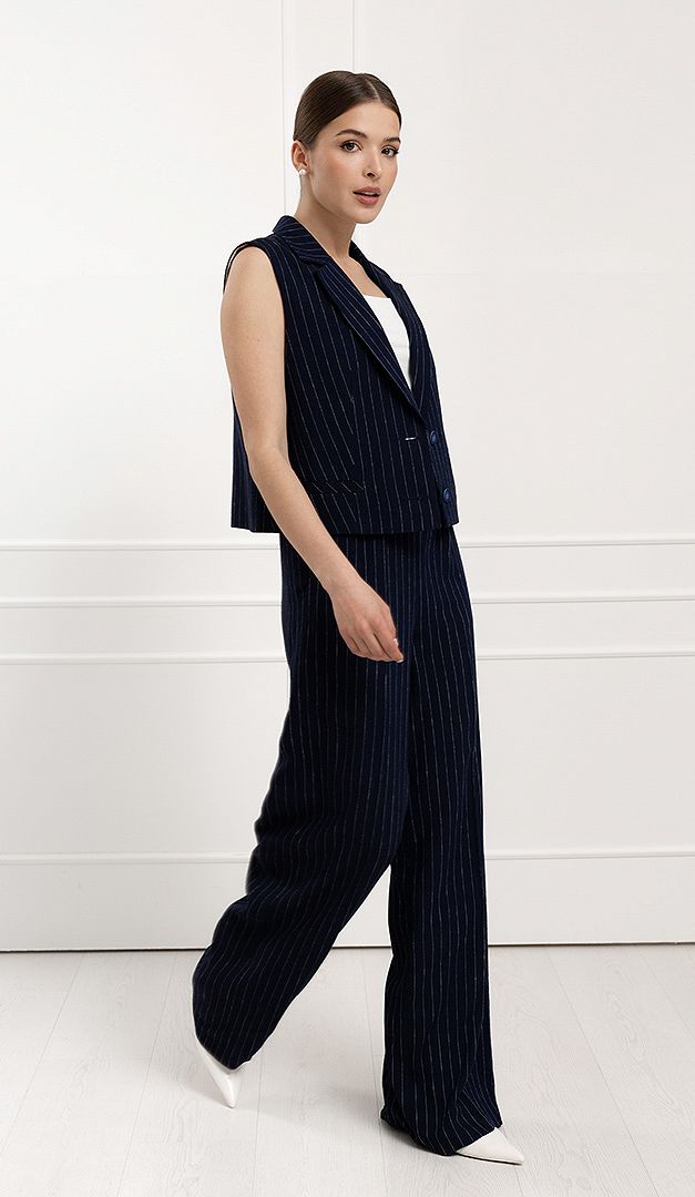 На фото створений образ з штанами в смужку синіми (арт.2890) і топом на широких бретелях молочним (арт.2658).