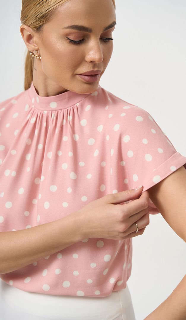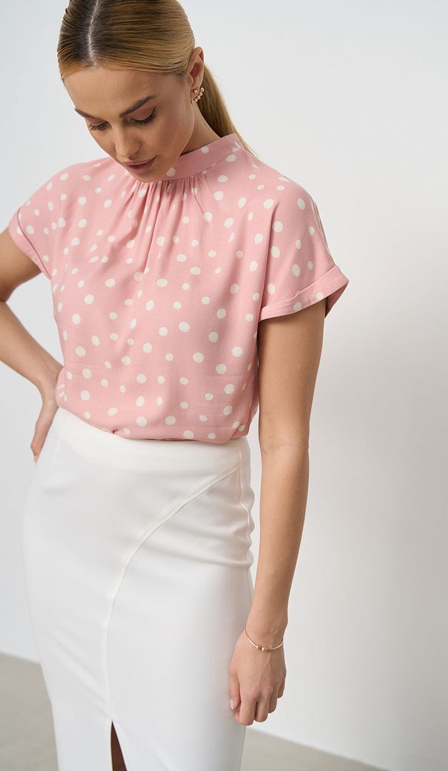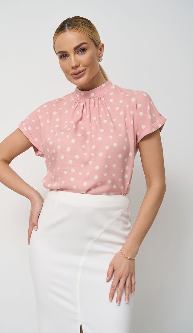 Ніжна романтична блузка в стильний горошок для офісного look-а і просто на кожен день! Її носити – одне задоволення, так як виготовлена блузка повністю з натуральної тканини – 100% віскози. Модель має прямий напіввільний крій з суцільнокроєним рукавом з невеликим відворотом, що прикриває лінію плеча. А ті, хто люблять жіночні деталі, неодмінно оцінять акуратний комір-стійку з кокетливими шалевими зав'язками. Ще один грайливий штрих – це невеликий виріз по спинці.