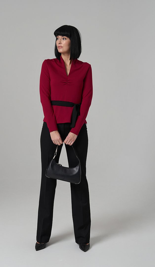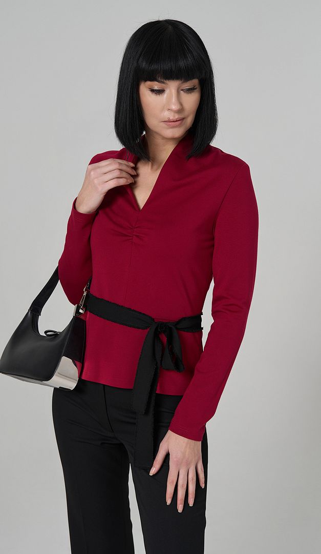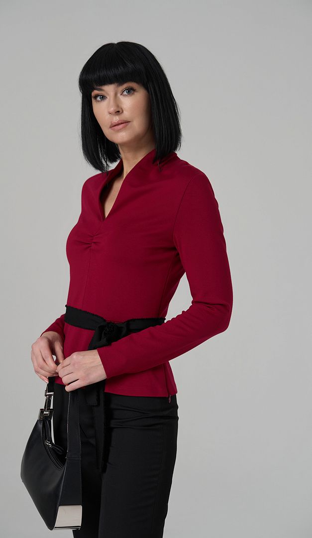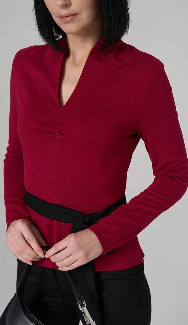 Блузон з поясом бордо — оригінальна річ для базового жіночого гардеробу. Модель, неодмінно, сподобатися вам своєю практичністю та універсальністю, так як виготовлена з м'якої трикотажної тканини в монохромному насиченому кольорі. Блузон з поясом бордо має подовжений облягаючий крій, що злегка розширений донизу та довгий рукав. Оригінальний V-подібний виріз горловини з невеликою цільно кроєною стійкою і з декоративними складками по центру візуально додають силуету стрункості. Лінія талії виробу доповнена контрастним поясом, який кріпиться по одному з бокових швів, а в іншому розташована потайна застібка-«блискавка».
