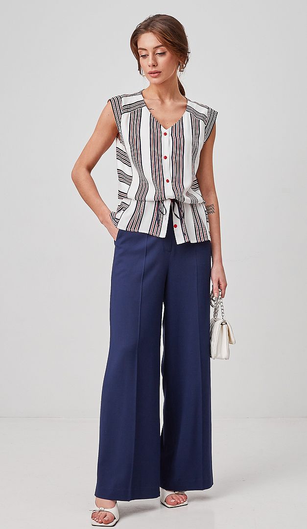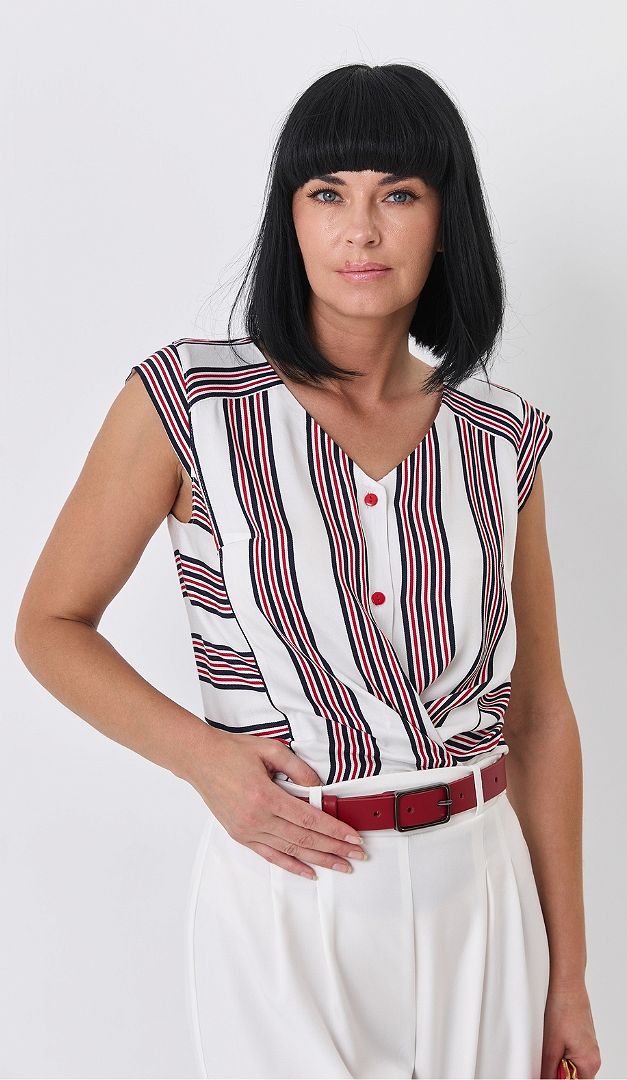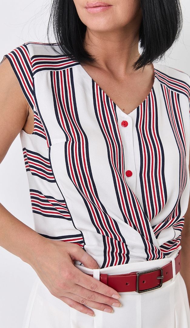 Оригінальний блузон в смужку на ґудзиках із 100% віскозної тканини — справжня знахідка для спекотних літніх днів. Модель прямого крою. Поглиблений V-подібний виріз горловини плавно переходить у зручну планку-застібку на ґудзики. Стильна родзинка блузону в смужку на ґудзиках — тонкий пасок-шнурівка, що акцентує увагу на жіночій талії. Лінія плеча лаконічно підкреслена короткими рукавами-”крильцями”.