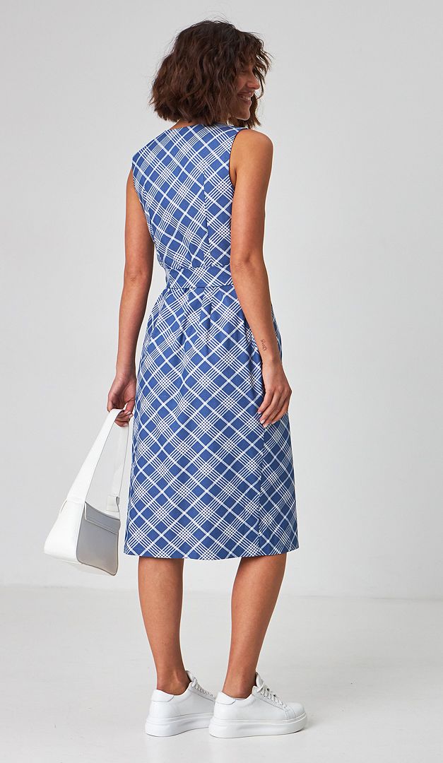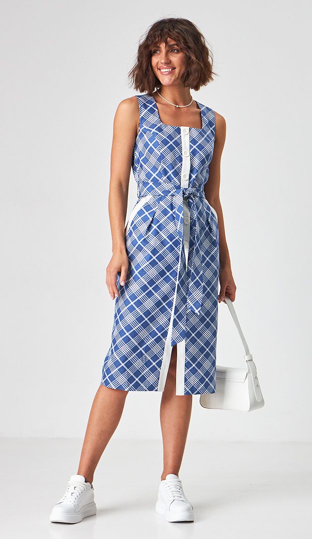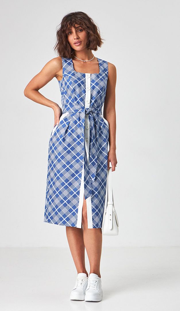 Чарівний літній сарафан джинсовий в клітинку зробить ваш образ ніжним і чуттєвим! Літній сарафан має оригінальний крій — з ефектно прилеглим верхом і злегка об'ємною спідничною частиною за рахунок великих складок. Квадратний виріз горловини і широкі бретелі сприяють зручній фіксації по фігурі. Для контрастності центральна застібка, а також функціональні бічні кишені оформлені планкою білого кольору. Щоб талія візуально здавалася більш витонченою, в комплекті з літнім сарафаном йде знімний пояс з аналогічної тканини. Виріб без підкладки.