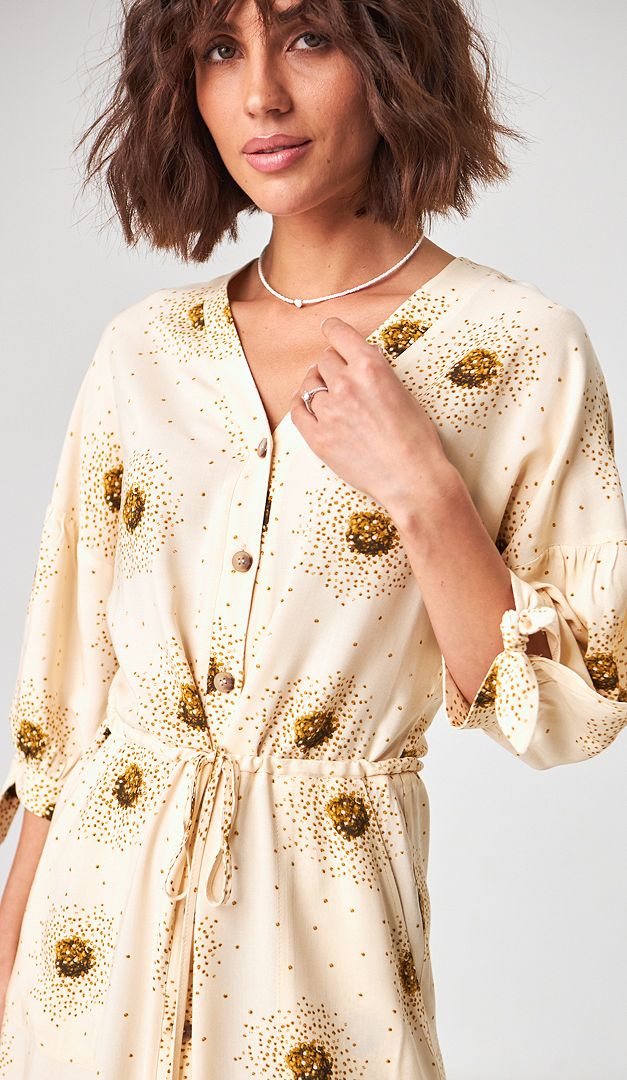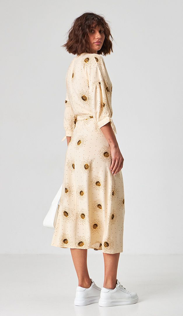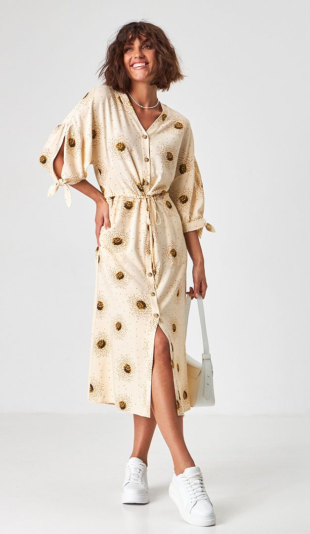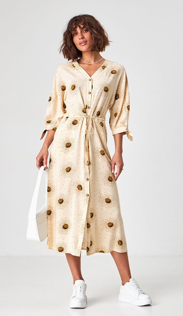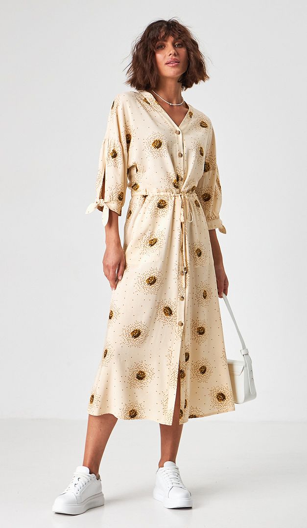 "Летюче" плаття максі з пишними рукавами займе лідируюче місце у Вашому гардеробі, так як в ньому Ви будете виглядати шикарно і на світських заходах, і на відпочинку, і на роботі! Саме ця модель буде доречна для різних подій. Плаття має напіввільний прямий крій з функціональною застібкою на ґудзики. Лаконічний V-подібний виріз горловини додасть візуальної стрункості силуету. Лінія талії ненав'язливо підкреслена за рахунок тонкого пояса-шнурівки. Плаття максі має плавно спадаючу збільшену лінію плеча. Вкорочений пишний рукав оформлений неширокою манжетою із зав'язками. Доповнено виріб двома бічними робочими кишенями. Без підкладки.